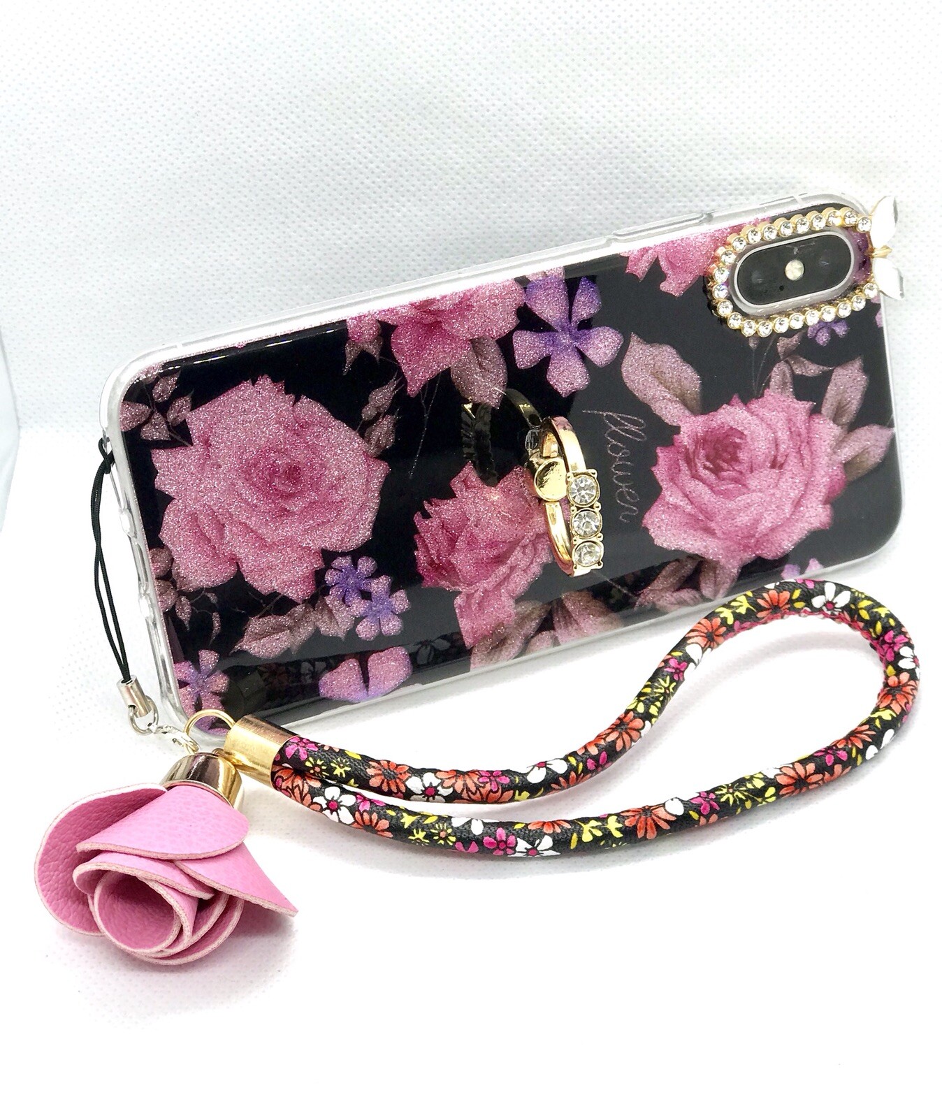 Bling Glitter Diamond Kickstand Ring Holder With Rosette Wrist Strap iPhone Case