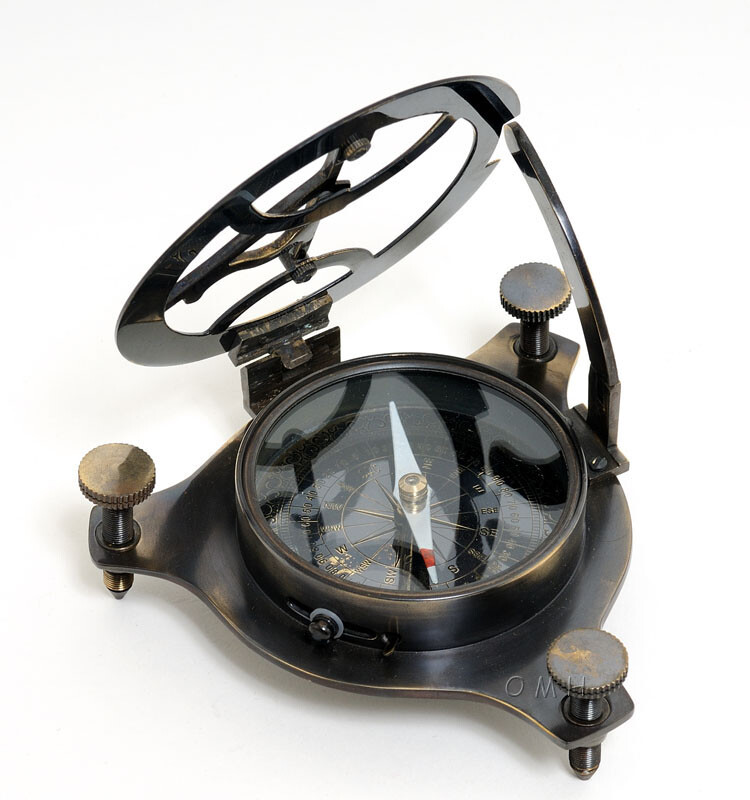 Folding Sundial Brass Compass 3.25 Antiqued w/ Wooden Case Nautical Decor
