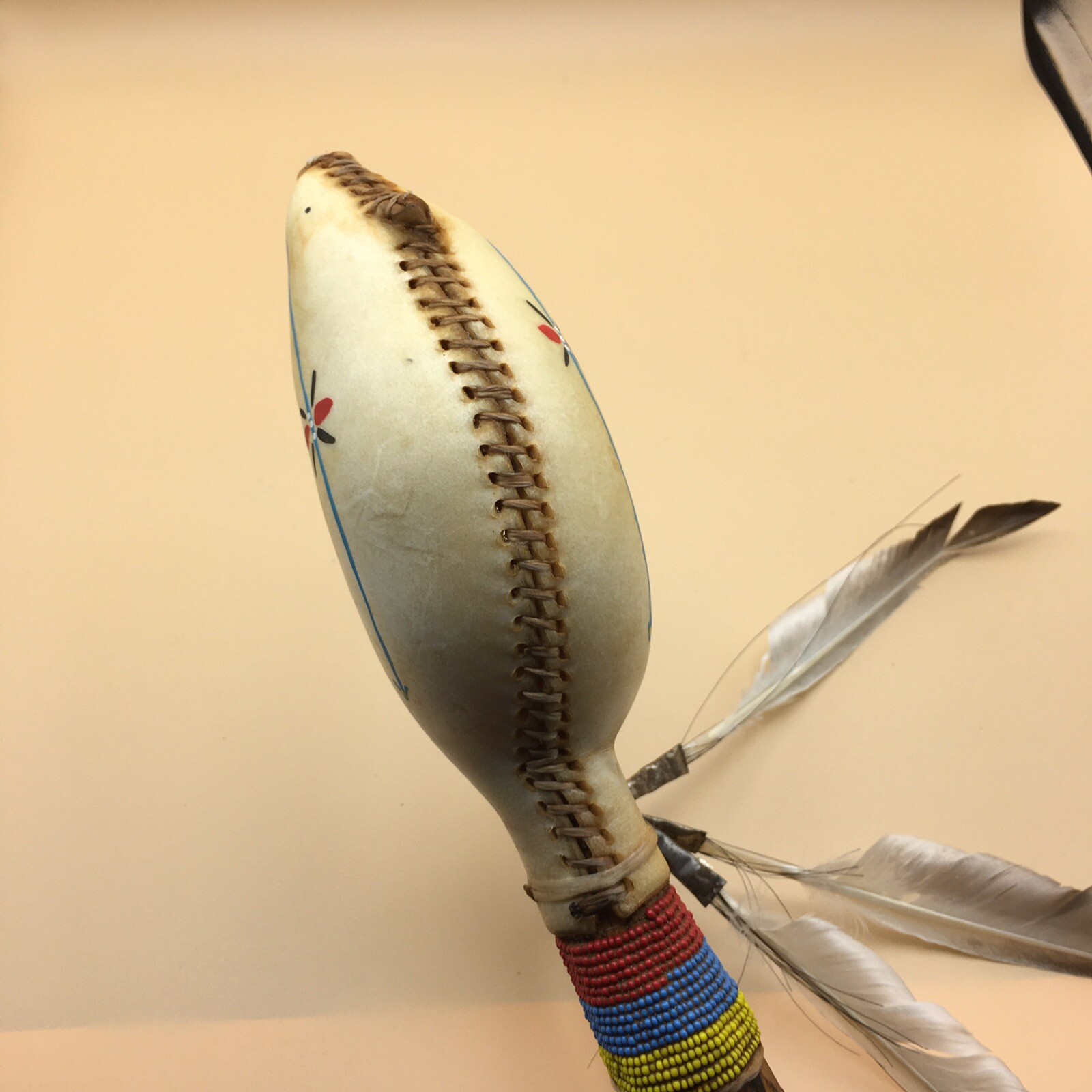 как выглядит Native American Rain Dance Stick Wood Handle Feathers Painted Leather Beaded фото