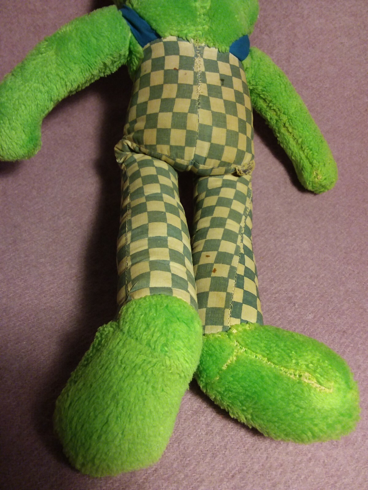 как выглядит Vintage 15" Dakin GREEN FROG BLUE CHECKED OVERALLS plush stuffed 70s фото
