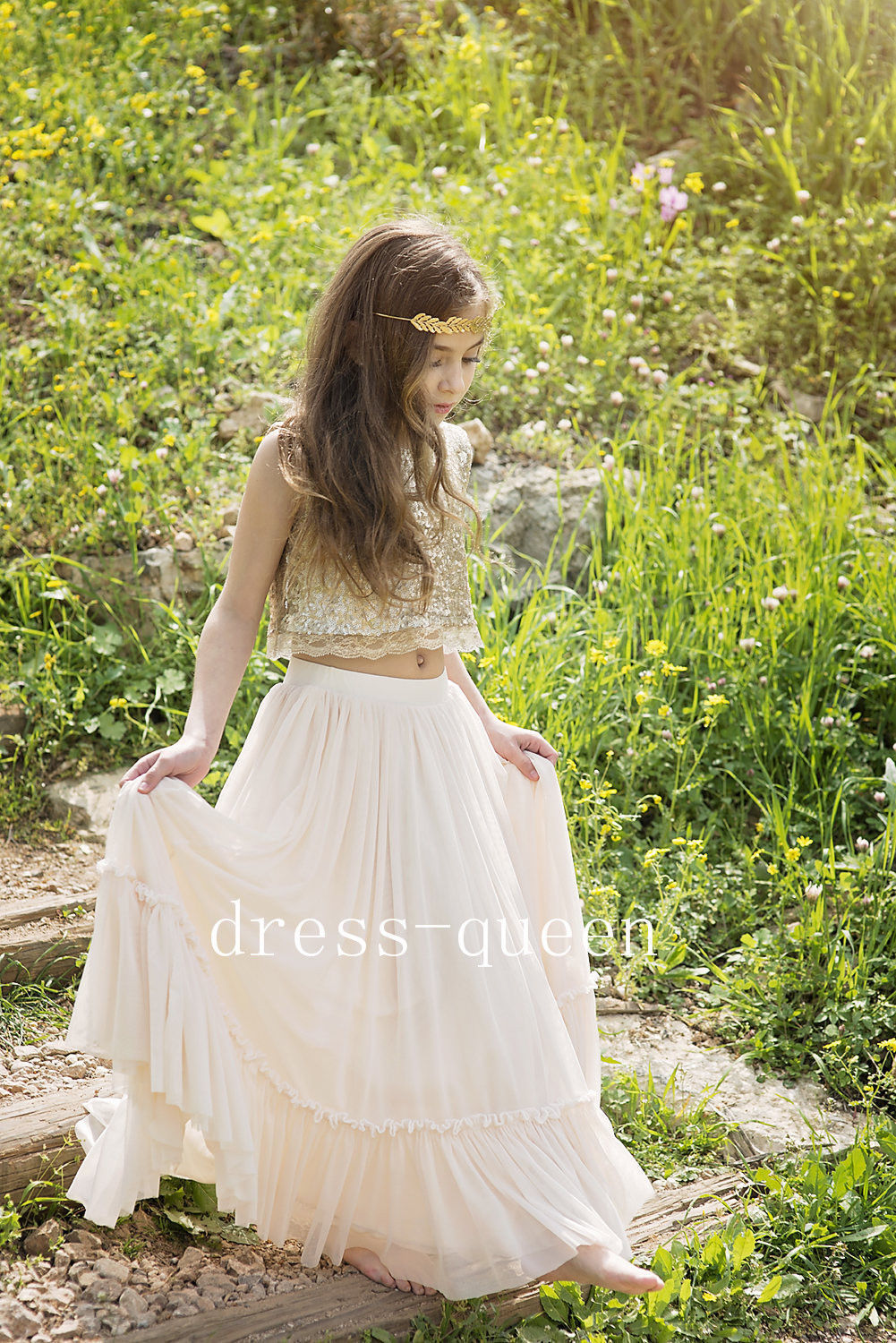 Two Pieces Prom Dress Girls Champagne Sequined Flower Girl Dresses Floor length
