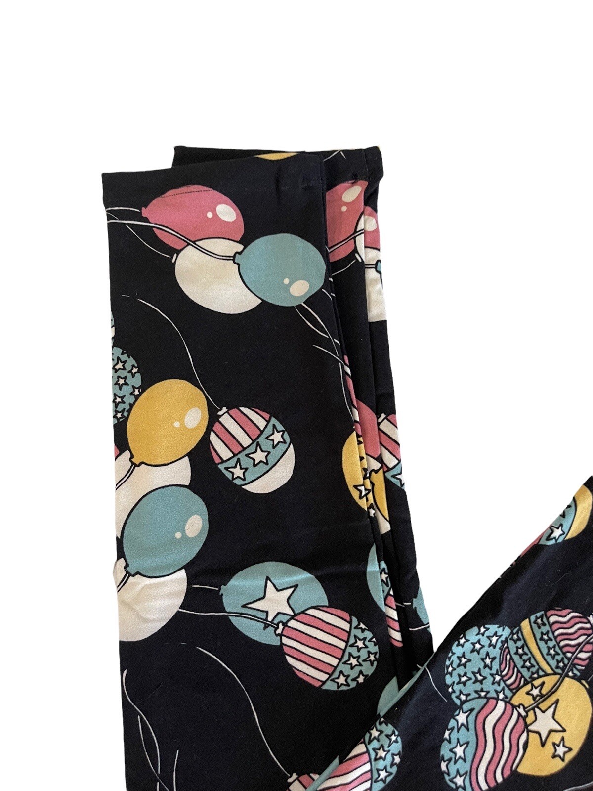 LULAROE One Size 4th Of July Stars Flag Balloons Black Pink Yellow Leggings 67