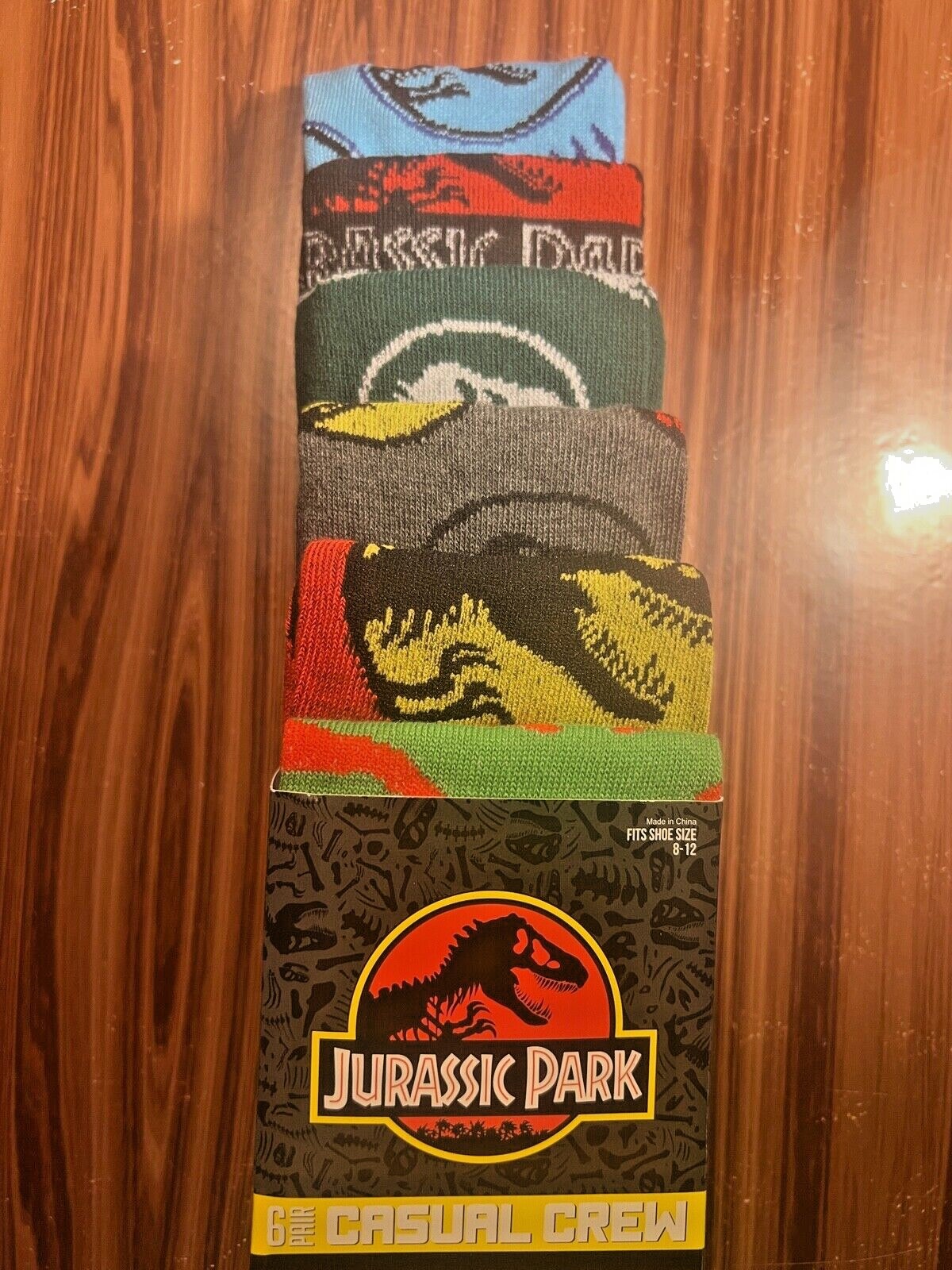 Jurassic Park World Movie Fossil T-Rex Mens 6 Pair Crew Socks Sock Size 8-12 NEW