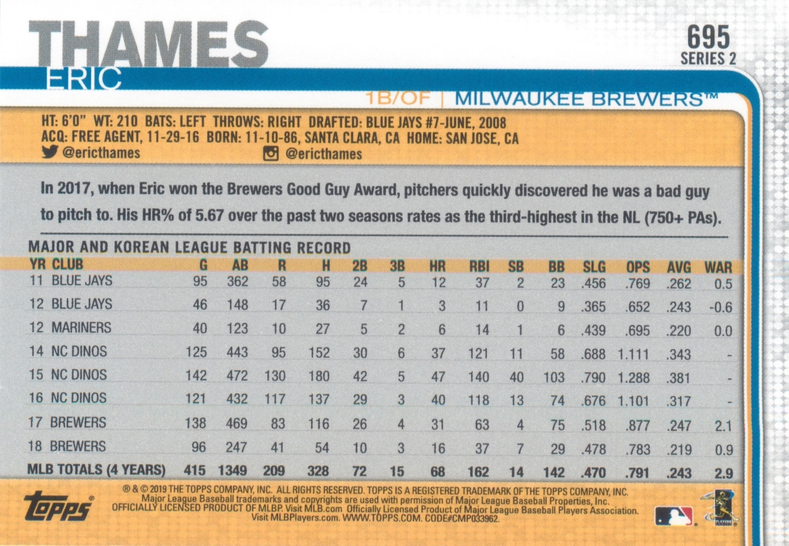 • Eric Thames 2019 Topps Series 2 Baseball MLB Base Card 695 Milwaukee Brewers