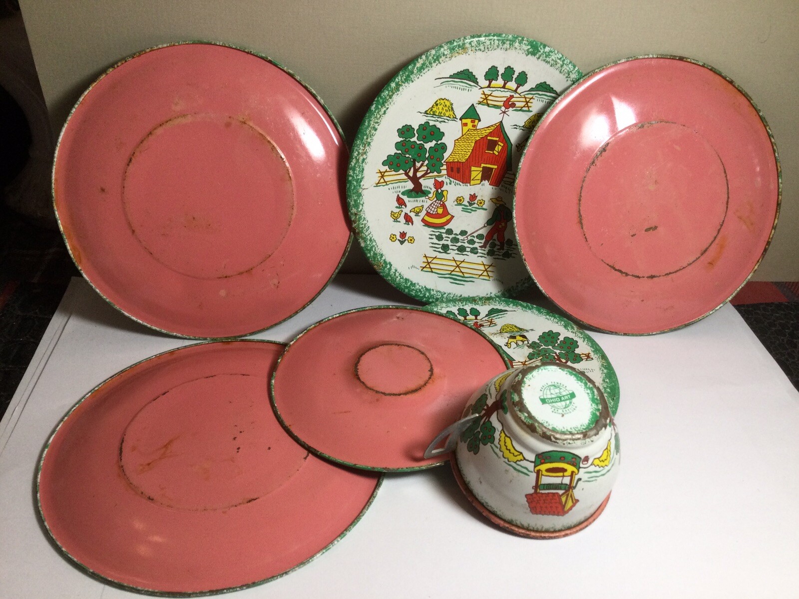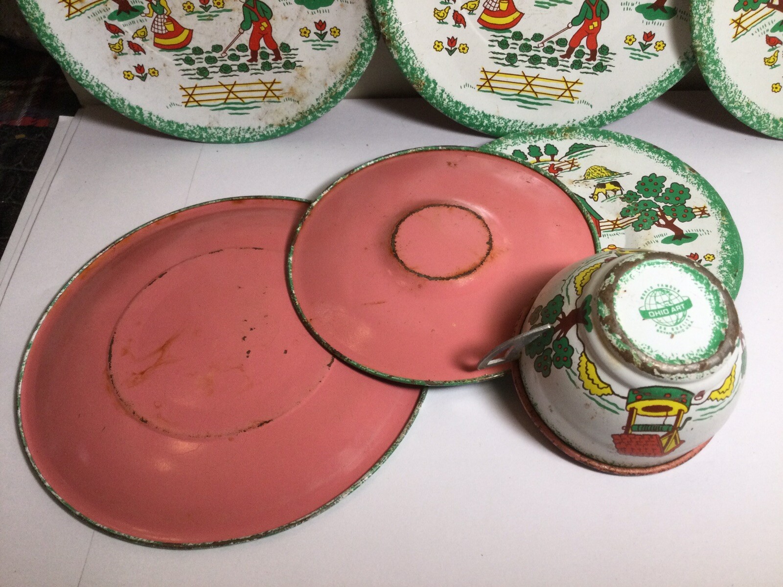 VINTAGE OHIO ART TIN-LITHO COUNTRY FARM CHILDS TEA SET DISHES 9 PIECES
