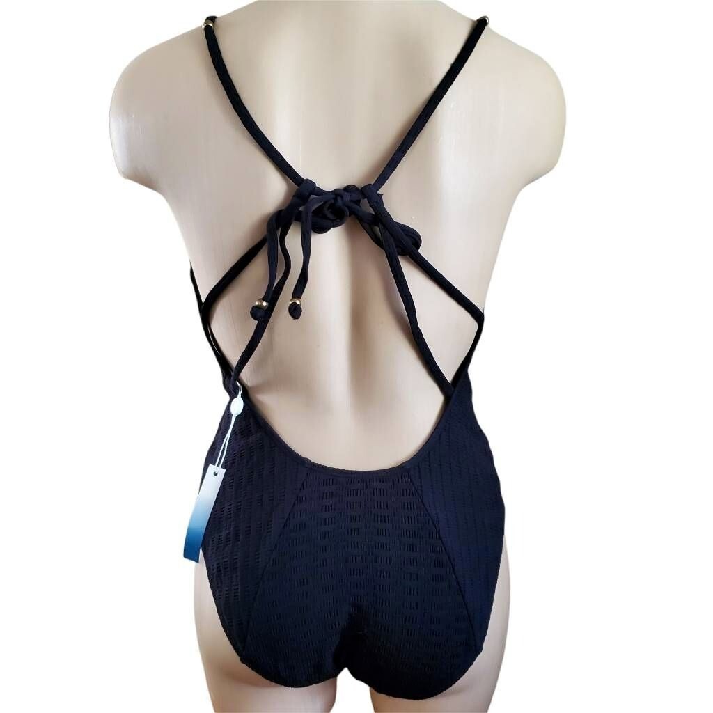 как выглядит Lucky Brand Womens One Piece Swimsuit Black Textured Plunge Neck Tie Back M New фото