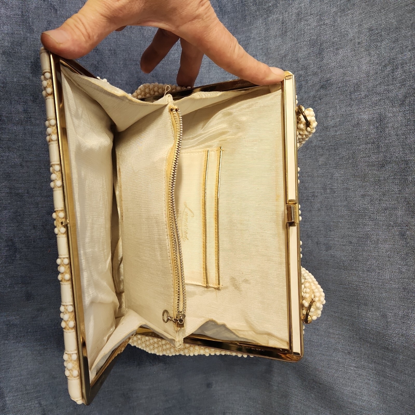 как выглядит Lumured Cream Beaded Purse Bag Handbag Made in the USA 1970 u-5D фото