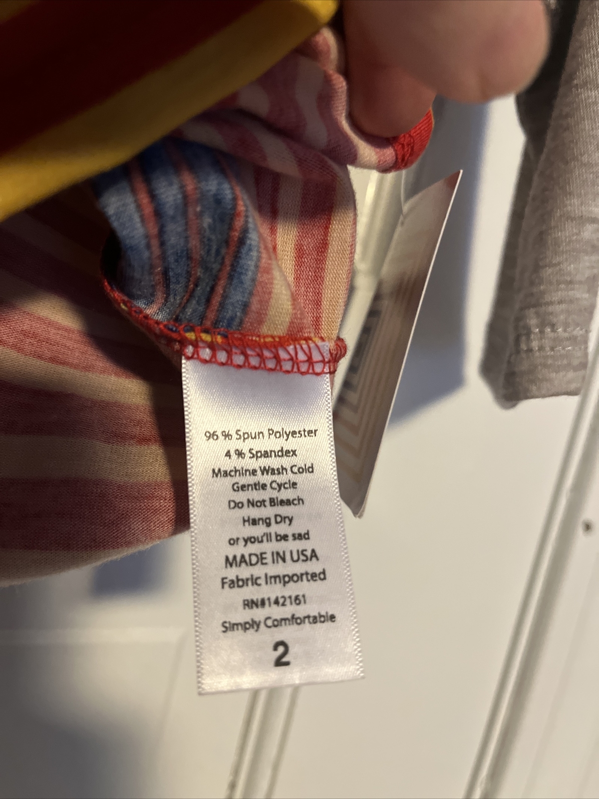 как выглядит NWT LuLaRoe Sloan 2 Baseball T- Red Yellow Blue Striped Gray Sleeve фото