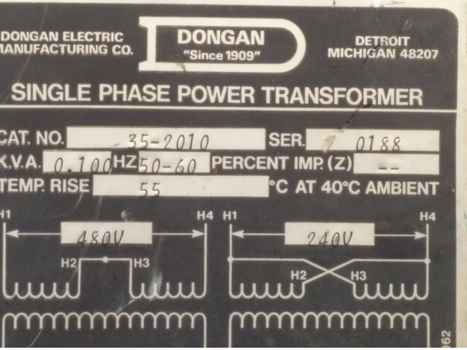 DONGAN 35-2010 SINGLE PHASE POWER TRANSFORMER, 480/240V 120V 50/60Hz