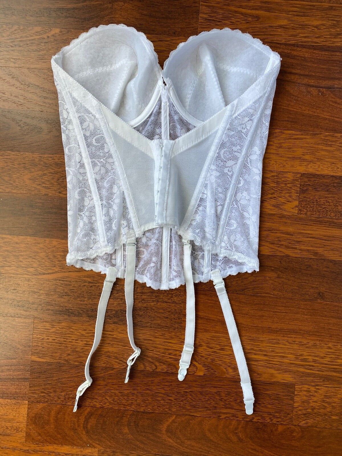 как выглядит WHITE Lace Low Back Strapless Bustier with Garters, lined cup, US 34D фото