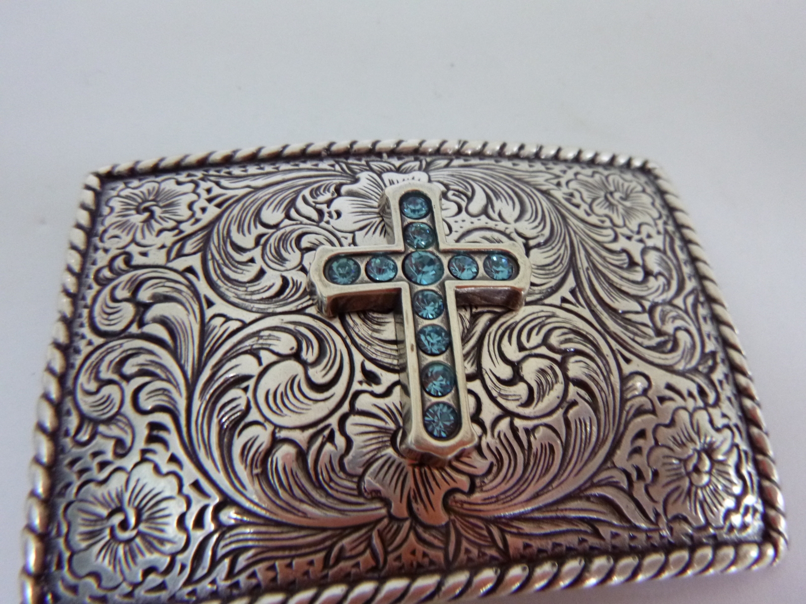 как выглядит Nocona Womens Belt buckle silver tone blue rhinestone Cross фото