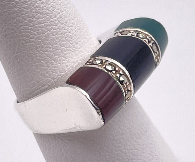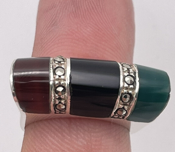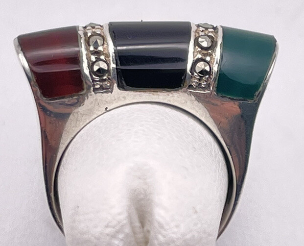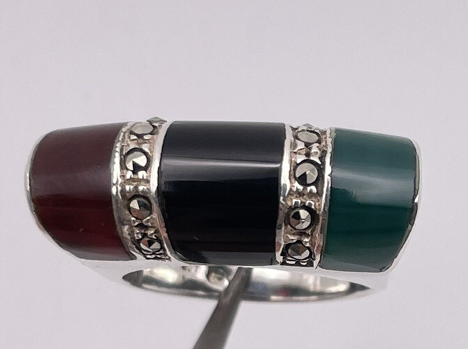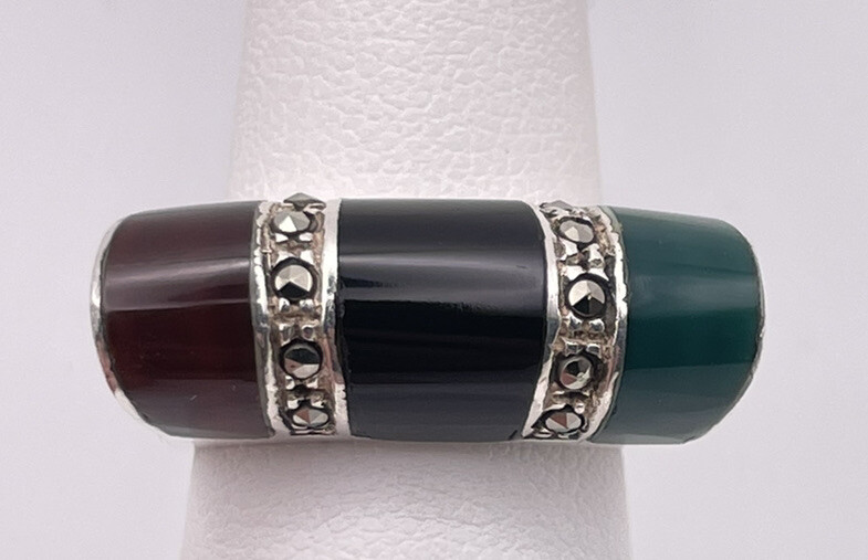 Beautiful Vintage Sterling Silver Green Black Onyx Carnelian Marcasite Ring