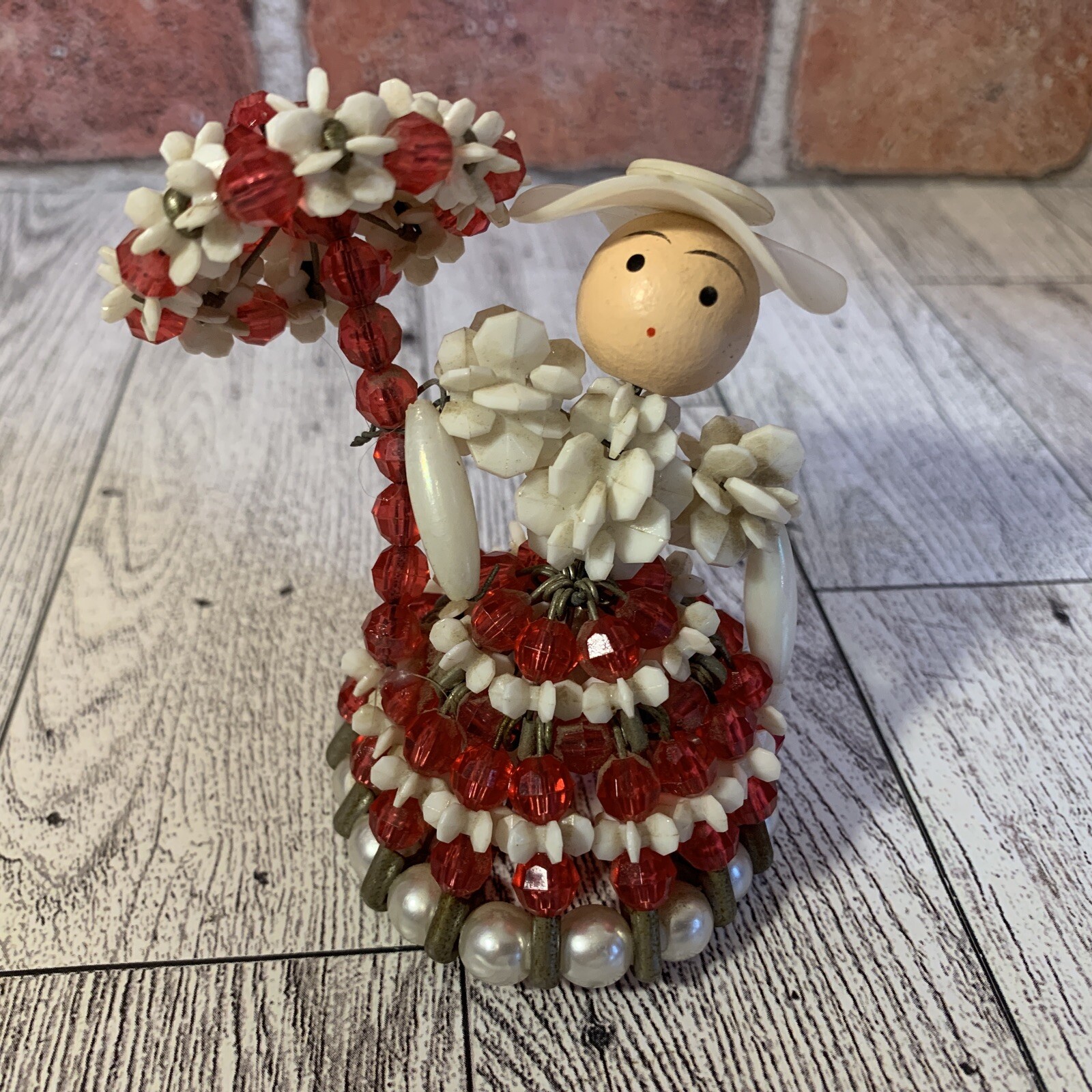 Vintage Safety Pin Beaded Handmade Southern Bell Doll W Umbrella Red/White