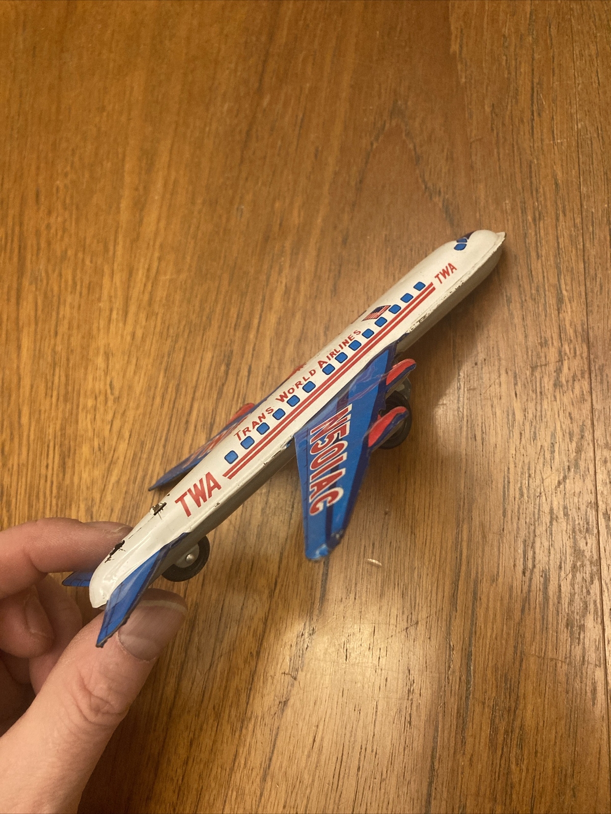 VINTAGE 7 TIN FRICTION AIRPLANE TOY - TRANS WORLD AIRLINES TWA N501AC JAPAN