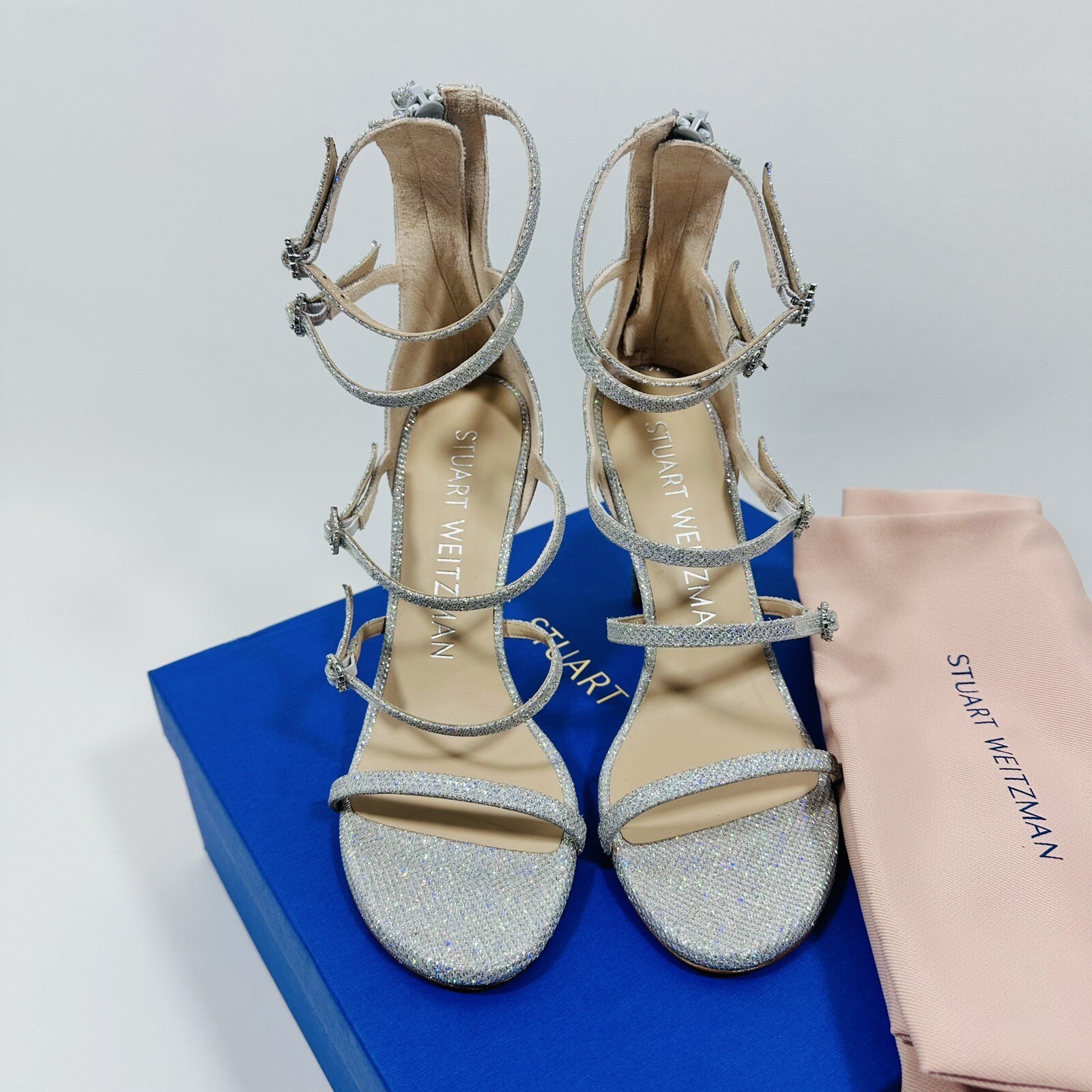 как выглядит NIB Stuart Weitzman Nudist Crystal Buckle Sandals 100mm Silver Glitter 7.5 625 фото