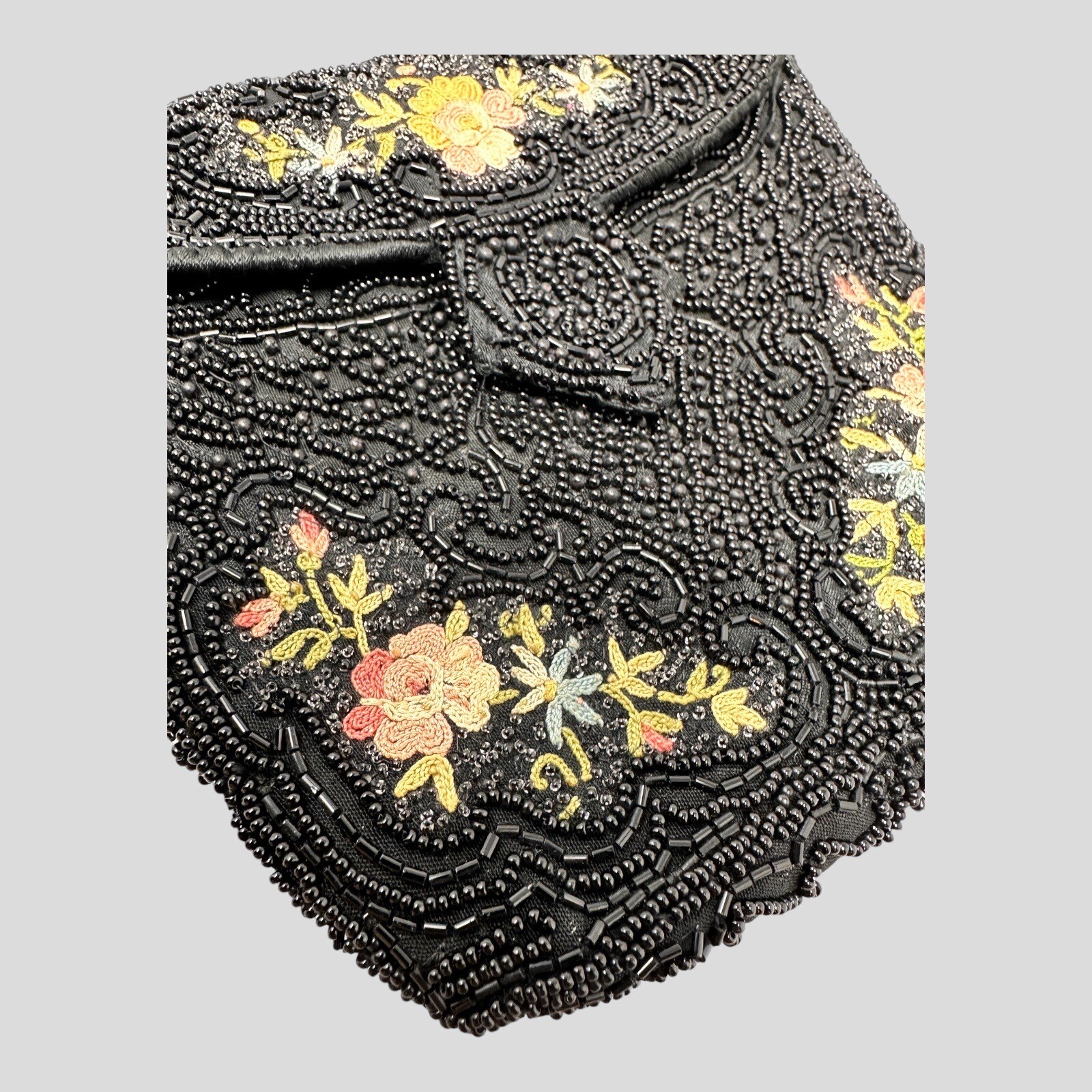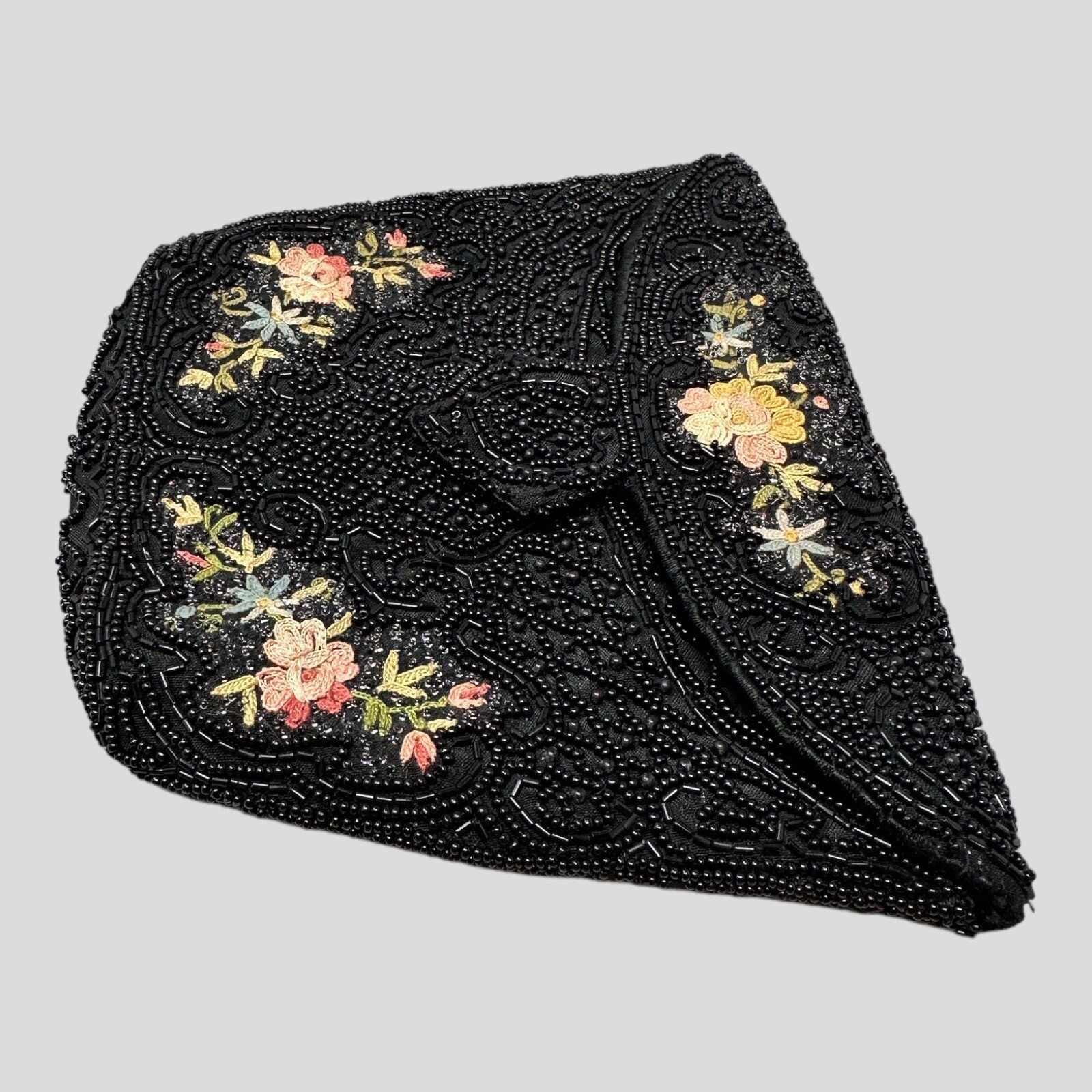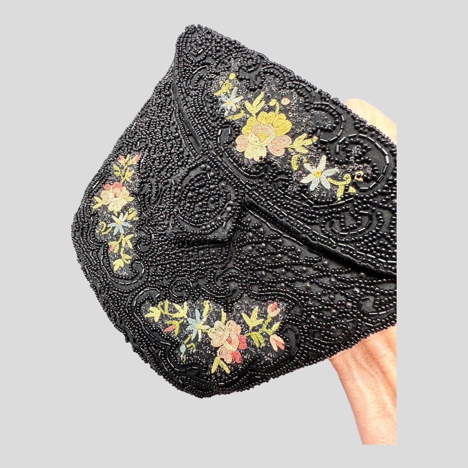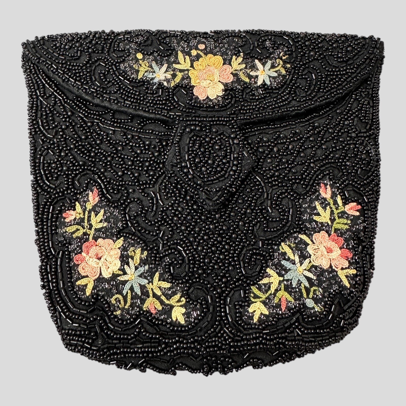 Antique French Black Glass Micro Beaded Floral Bag Foldover Clutch 5 1/2 x 6 3/4