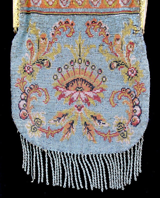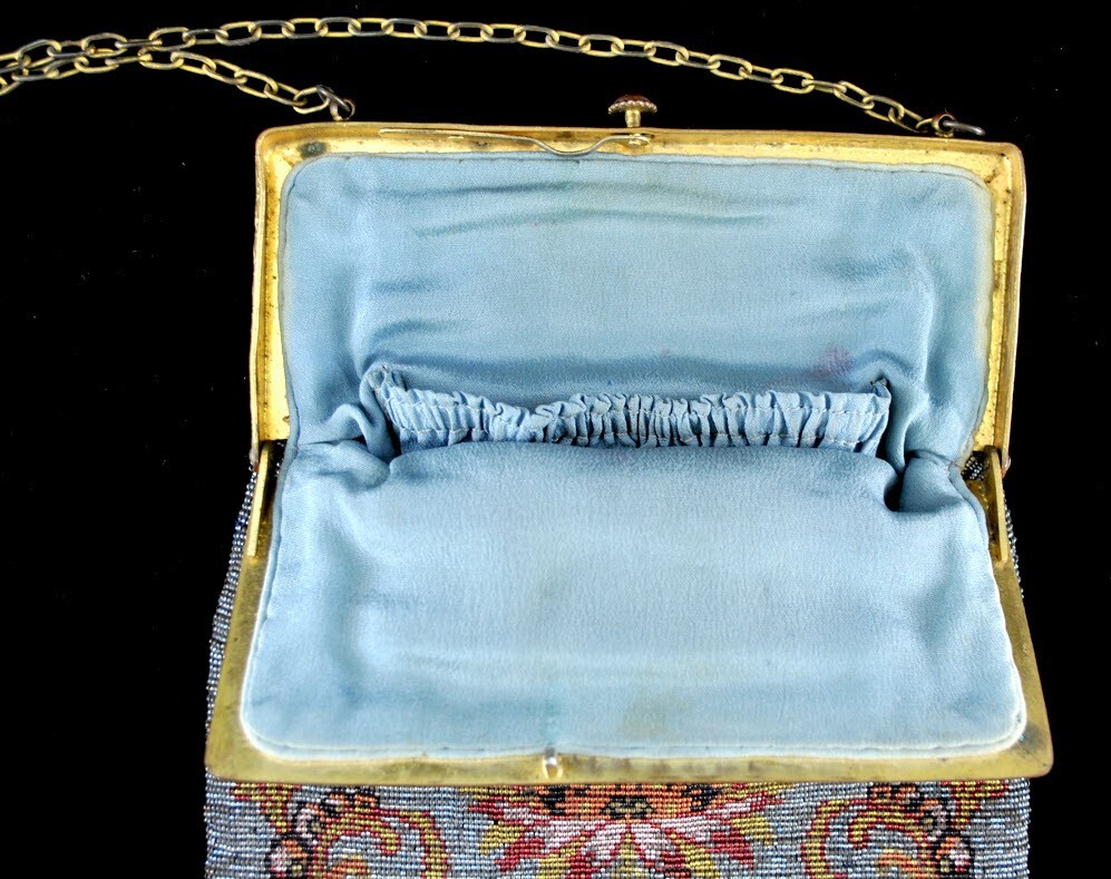 Antique French Art Nouveau Micro Metallic Beaded Bag Fringe Silk Lining-Exclnt
