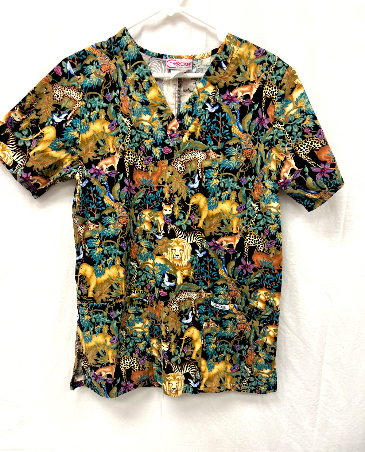 Cherokee Womens Scrub Top V Neck Vivid Colorful Wild Safari Animal Print Size S