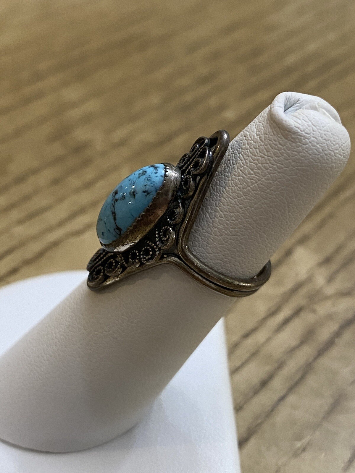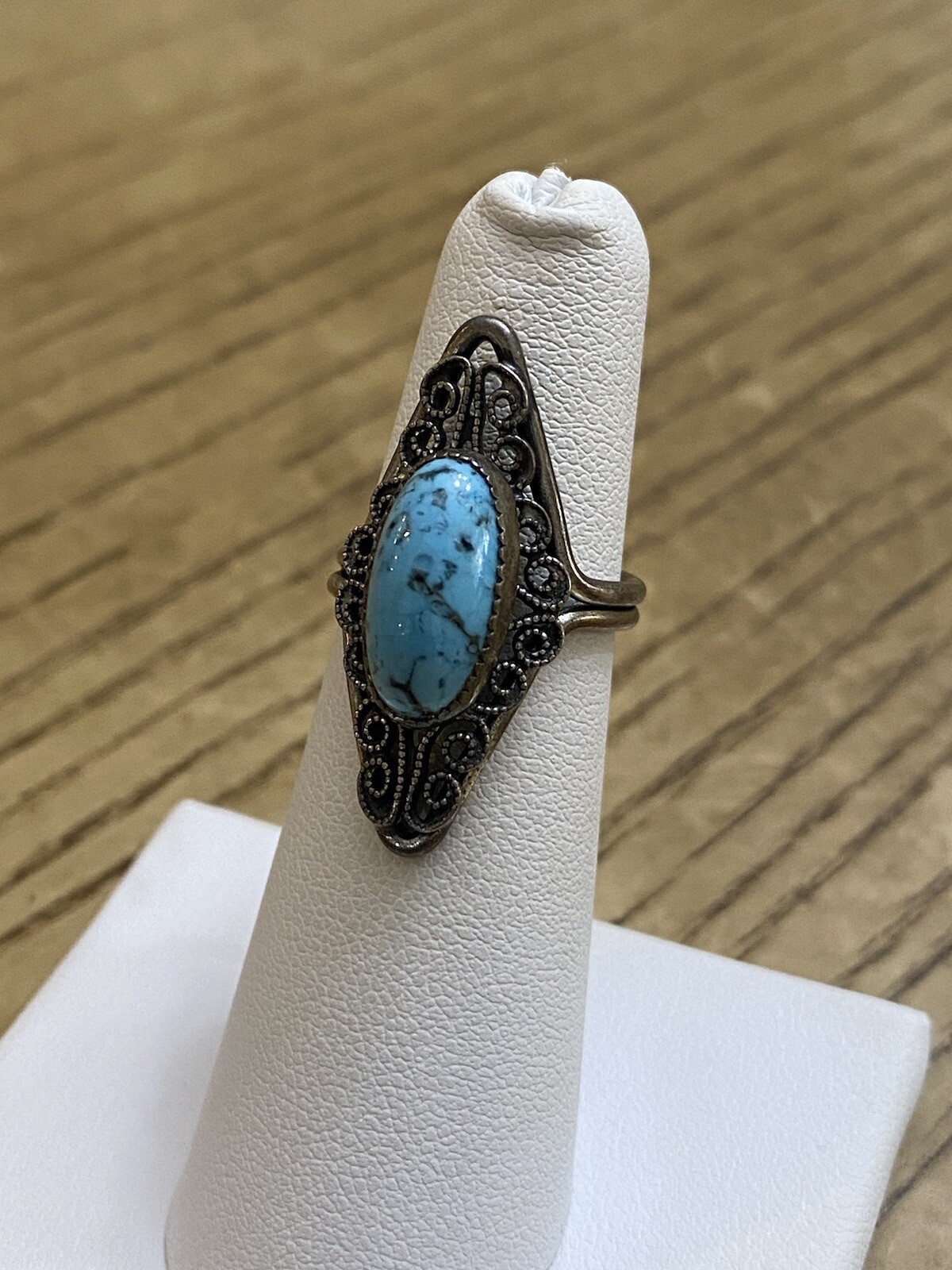 как выглядит Beau Sterling Silver 925 Signed Blue Turquoise Filigree Ring Size 5 Adjustable фото