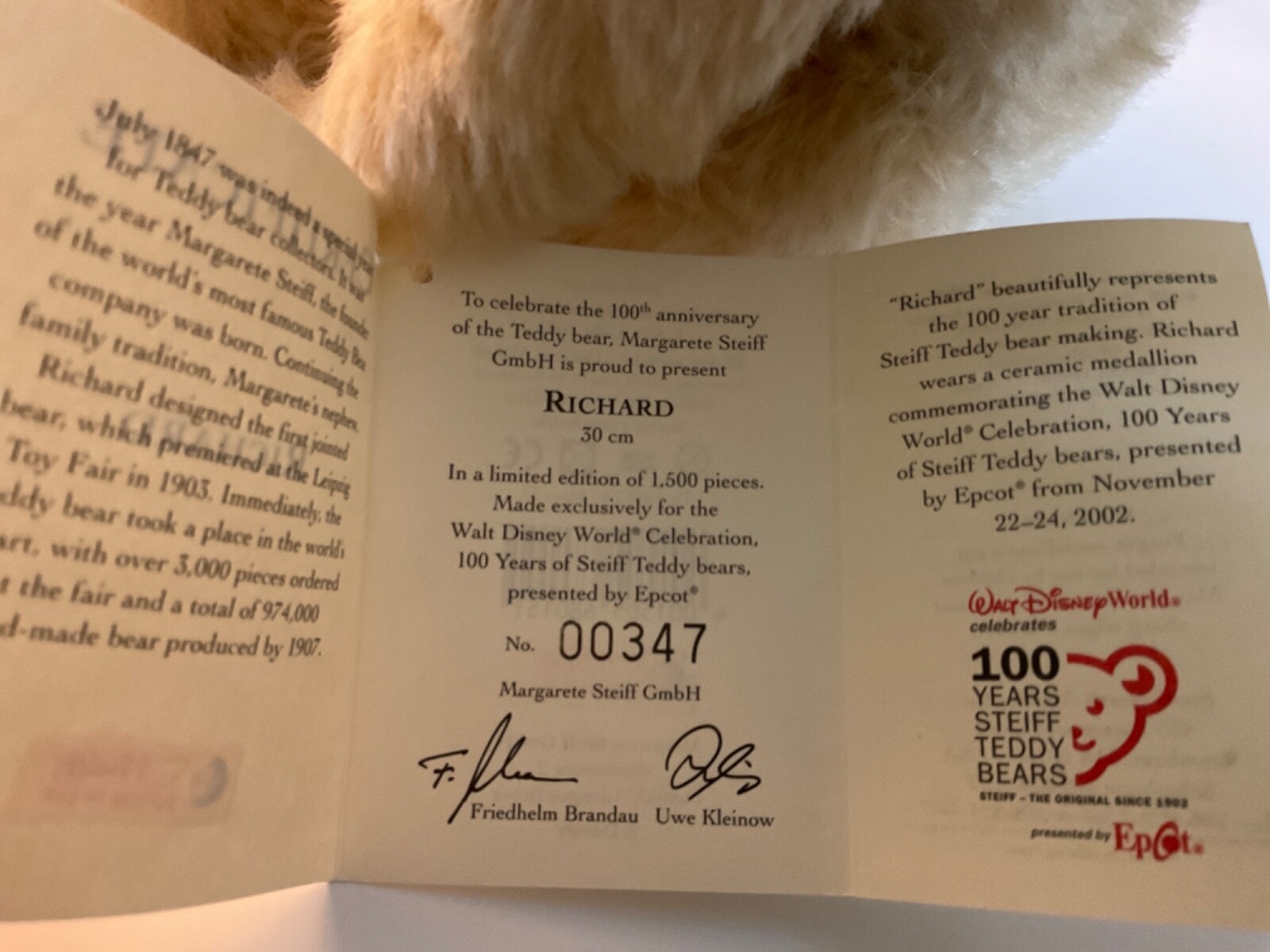 • Steiff "Walt Disney World Celebrates 100 years Steiff TB" signed, Germany