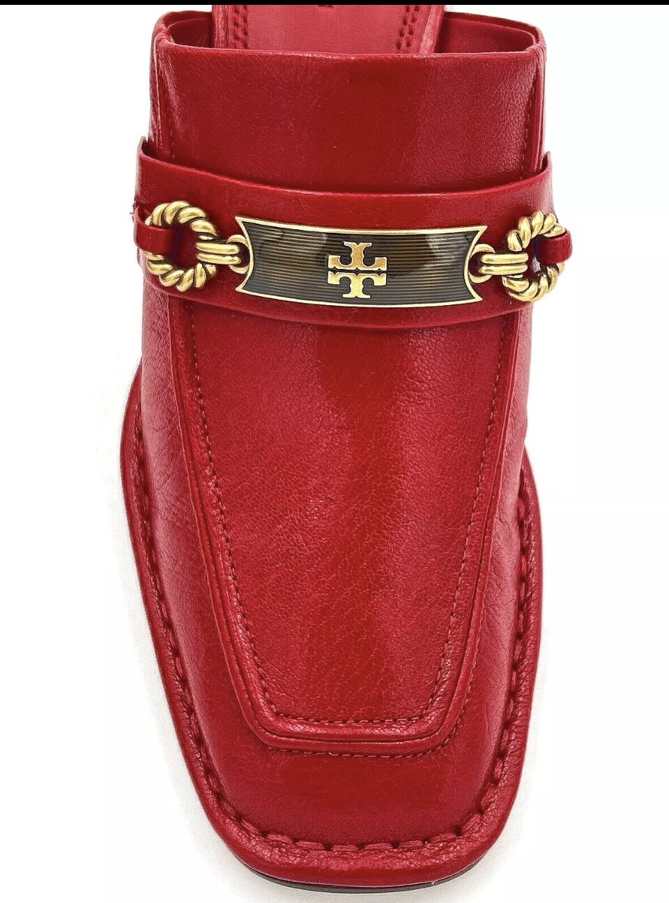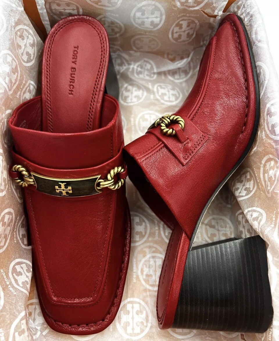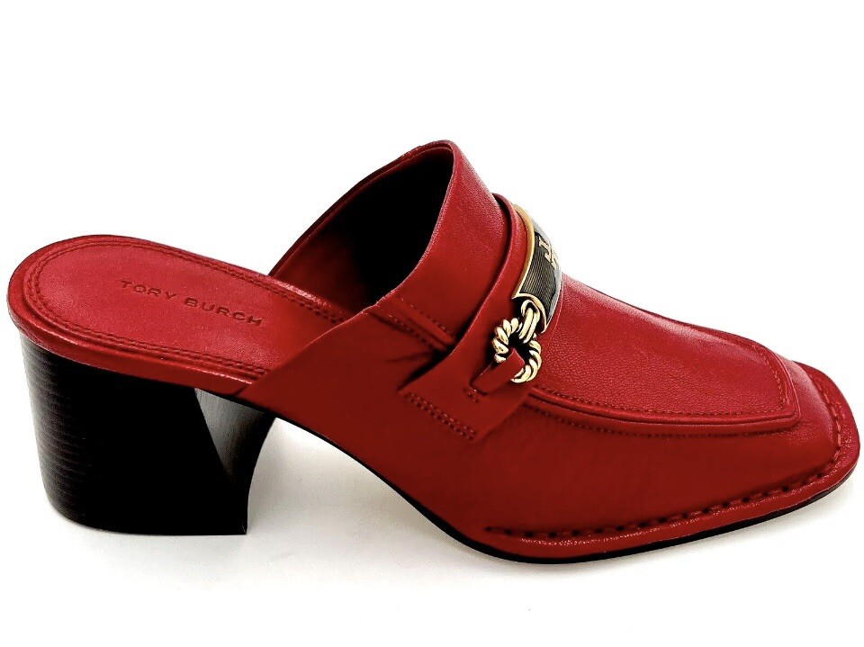 TORY BURCH PERRINE MULE 65MM HEEL TORY RED LEATHER LOGO PLAQUE SZ US 8 NIB