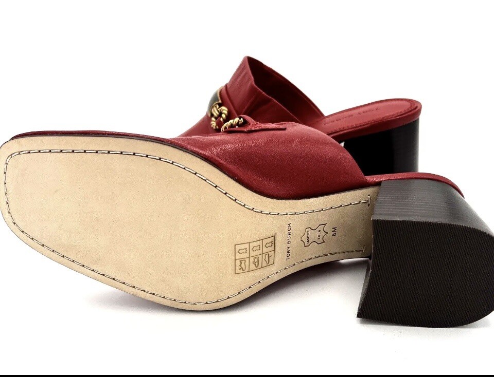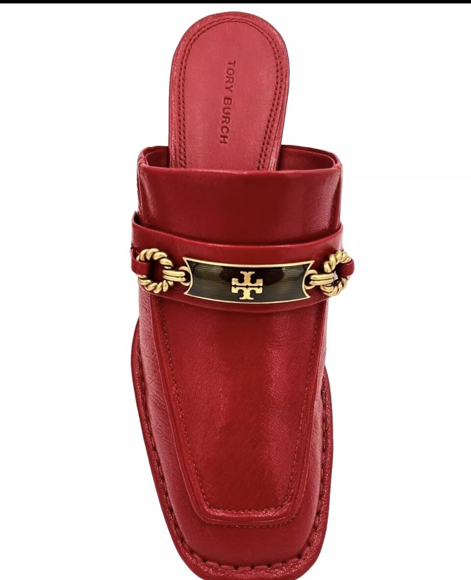 как выглядит TORY BURCH PERRINE MULE 65MM HEEL TORY RED LEATHER LOGO PLAQUE SZ US 8 NIB фото