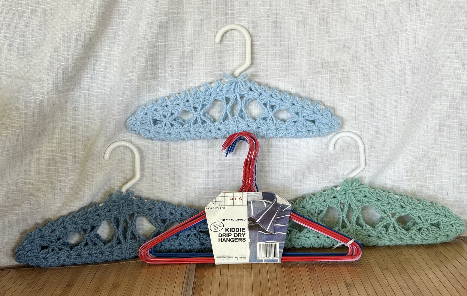 Vtg Boho Yarn 3 Crochet Covered And 12 Vinyl Dipped Kids Hangers Lot 15 Total
