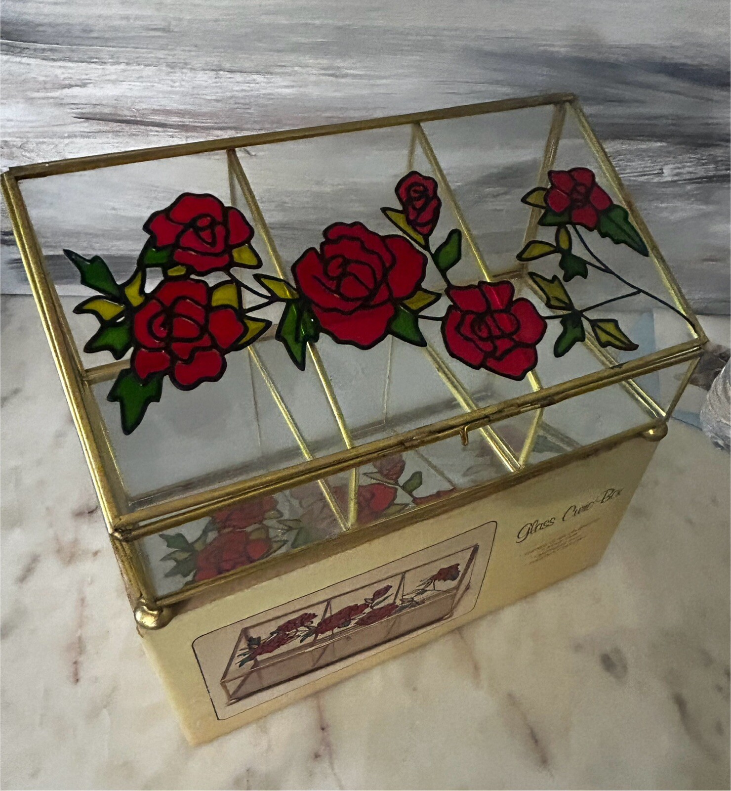 • Brass Stained Glass MIRRORED 3 compartment Jewelry Curio Trinket Box Hinged Lid