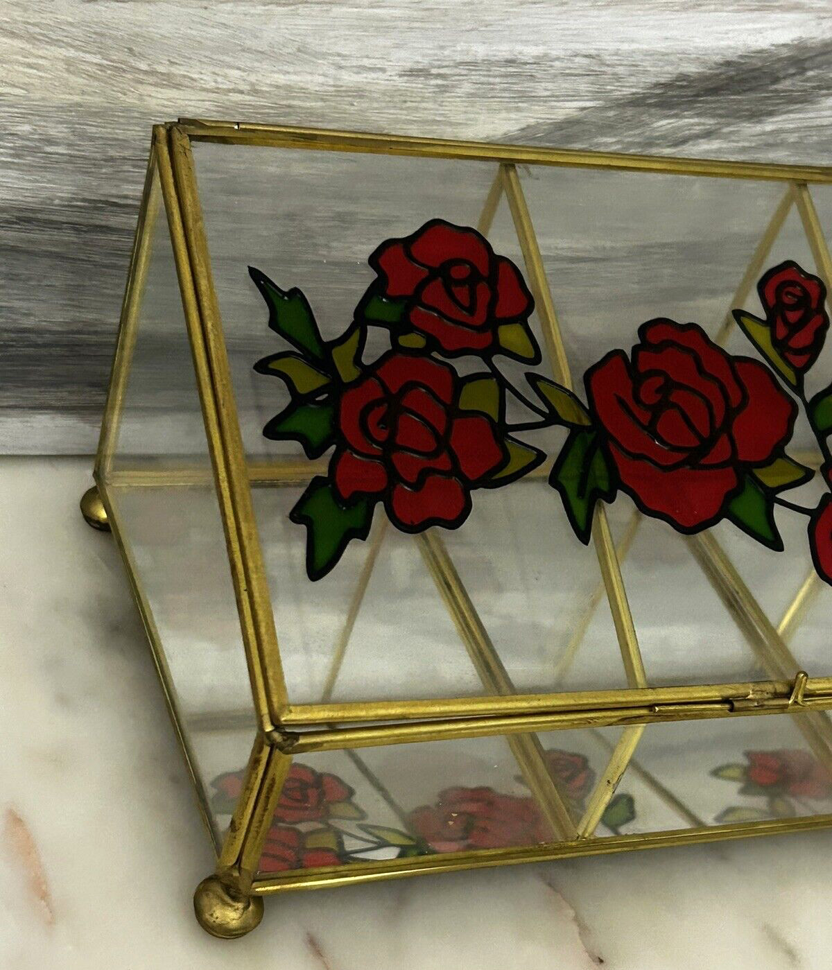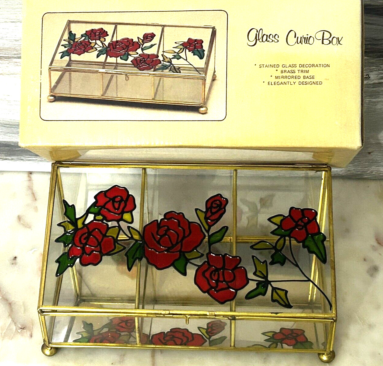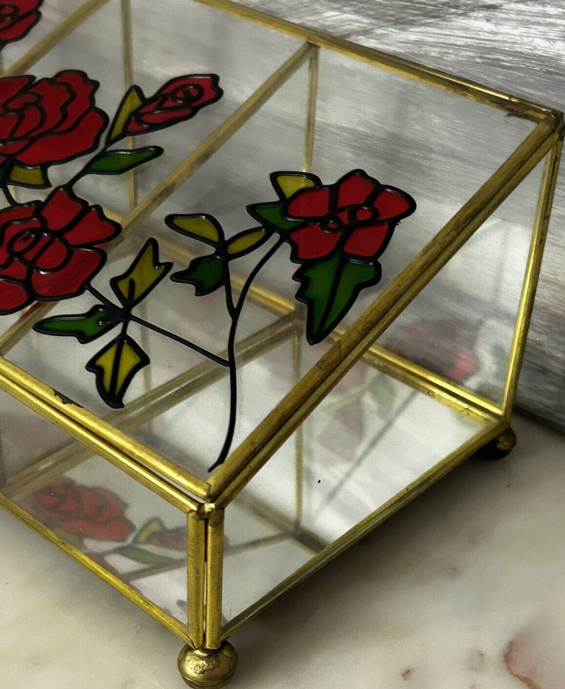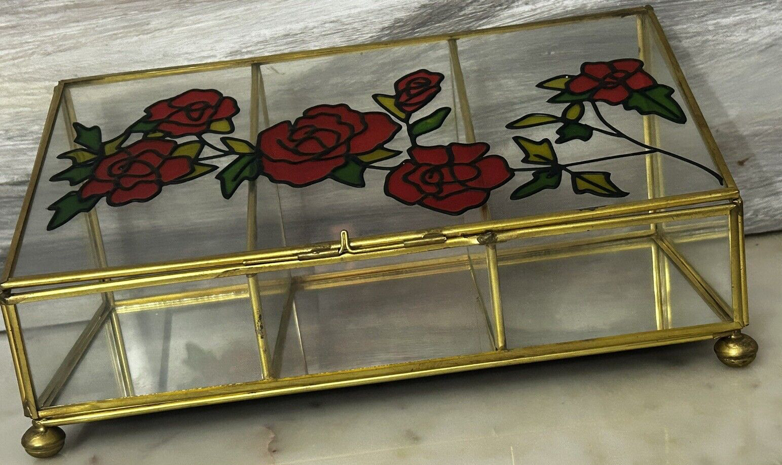 Brass Stained Glass MIRRORED 3 compartment Jewelry Curio Trinket Box Hinged Lid