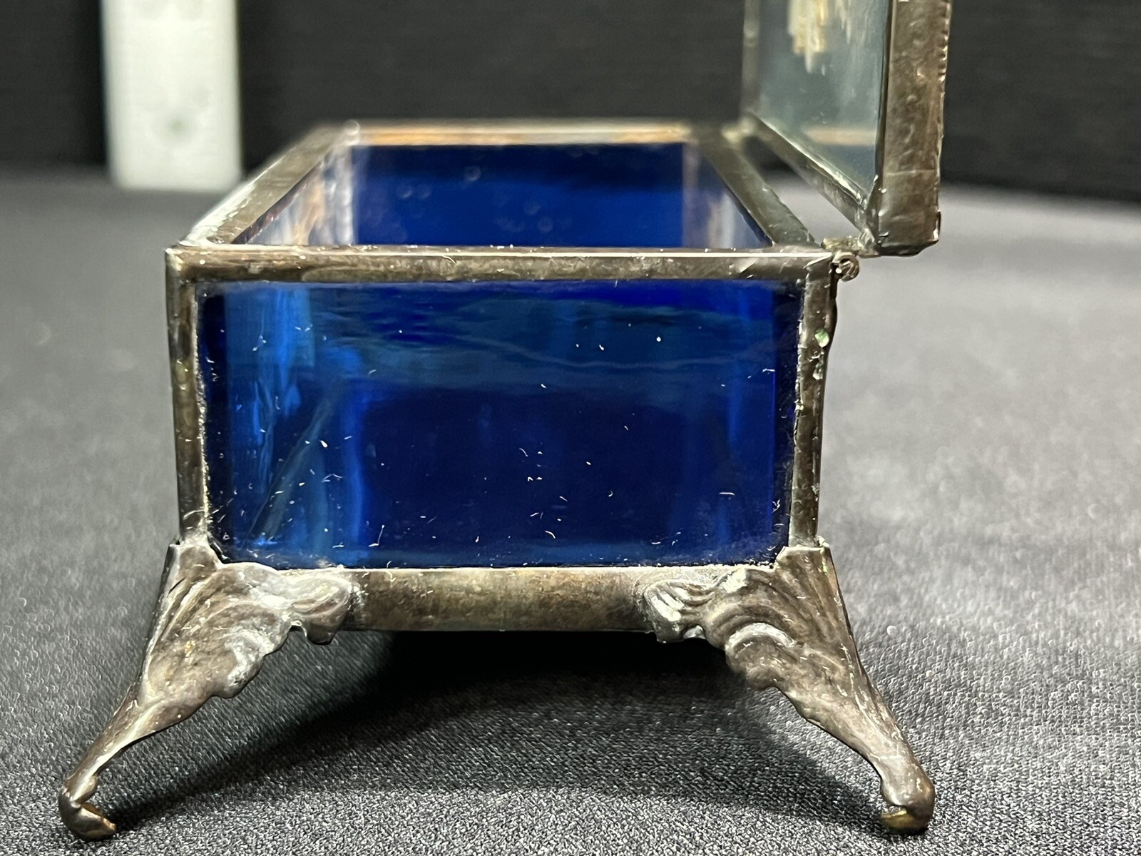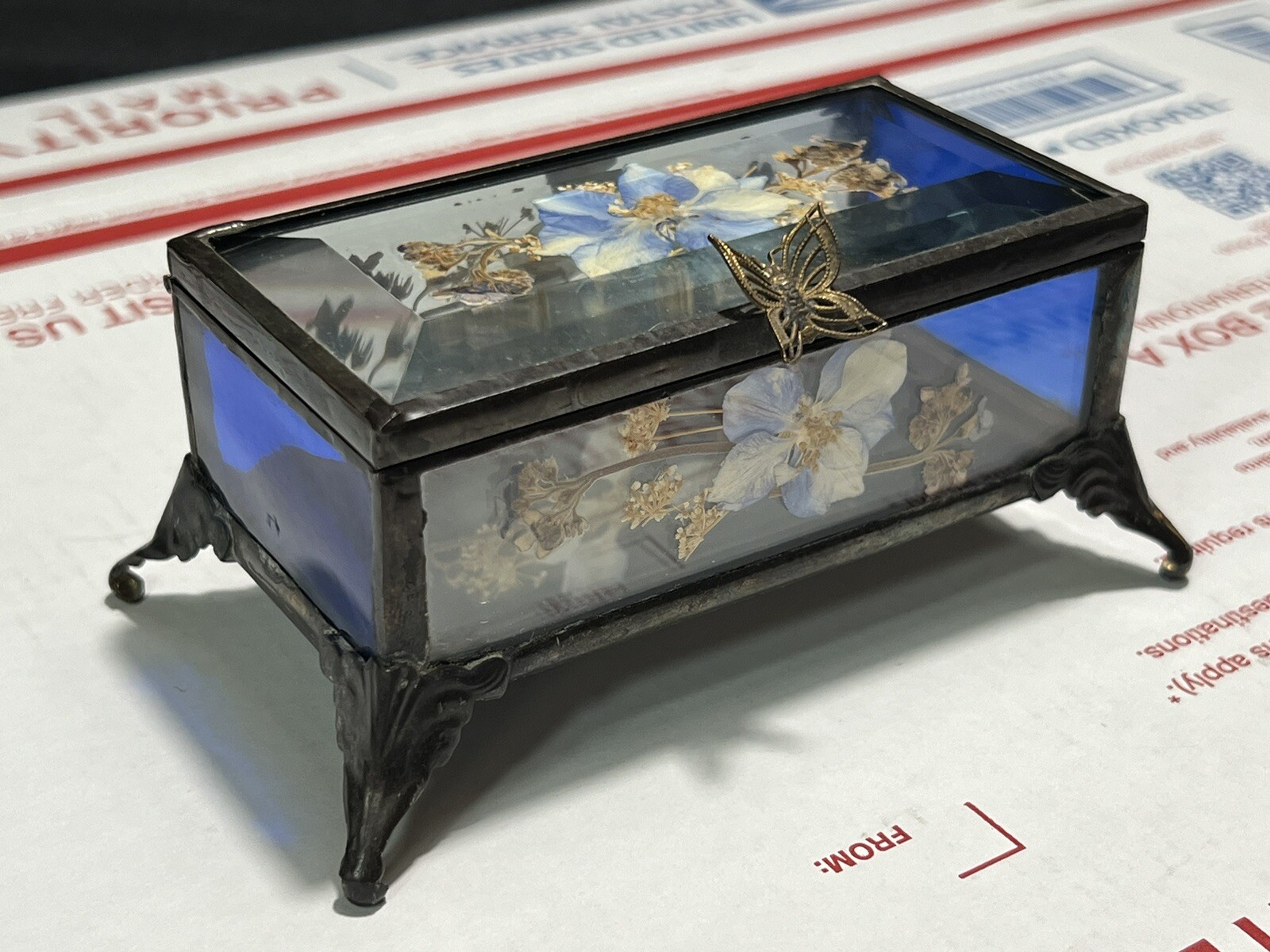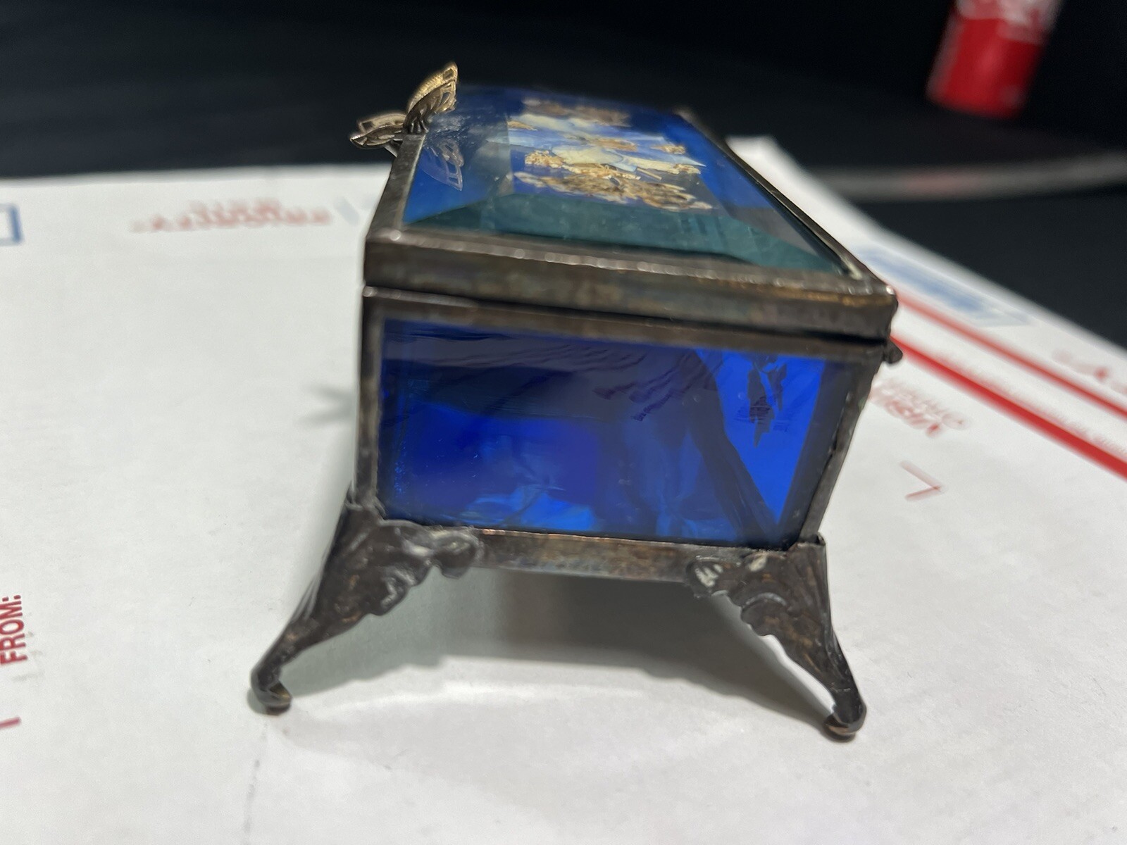 • Mirrored Beveled Glass Brass Footed Pill Trinket Box Flowers 4.75" Hinged