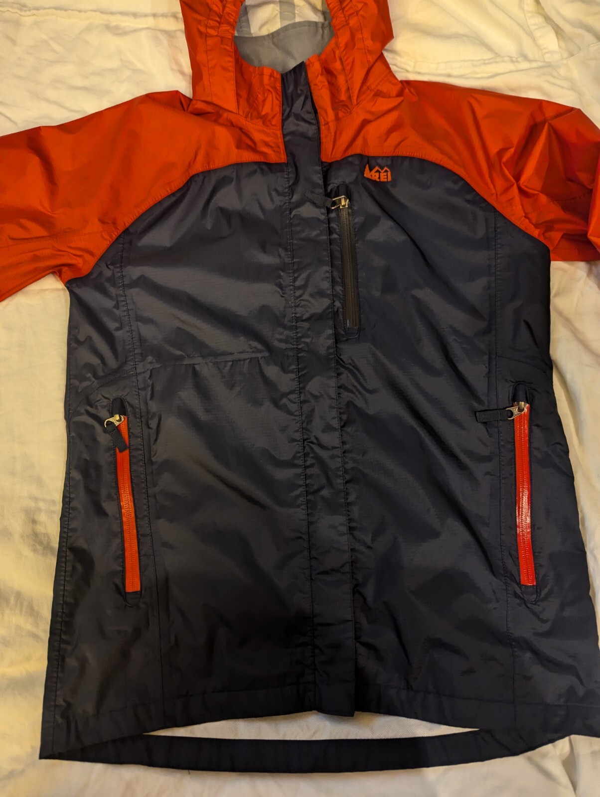 как выглядит Rei Rain jacket boys size 14-16 red full zip hooded nylon windbeaker pockets фото