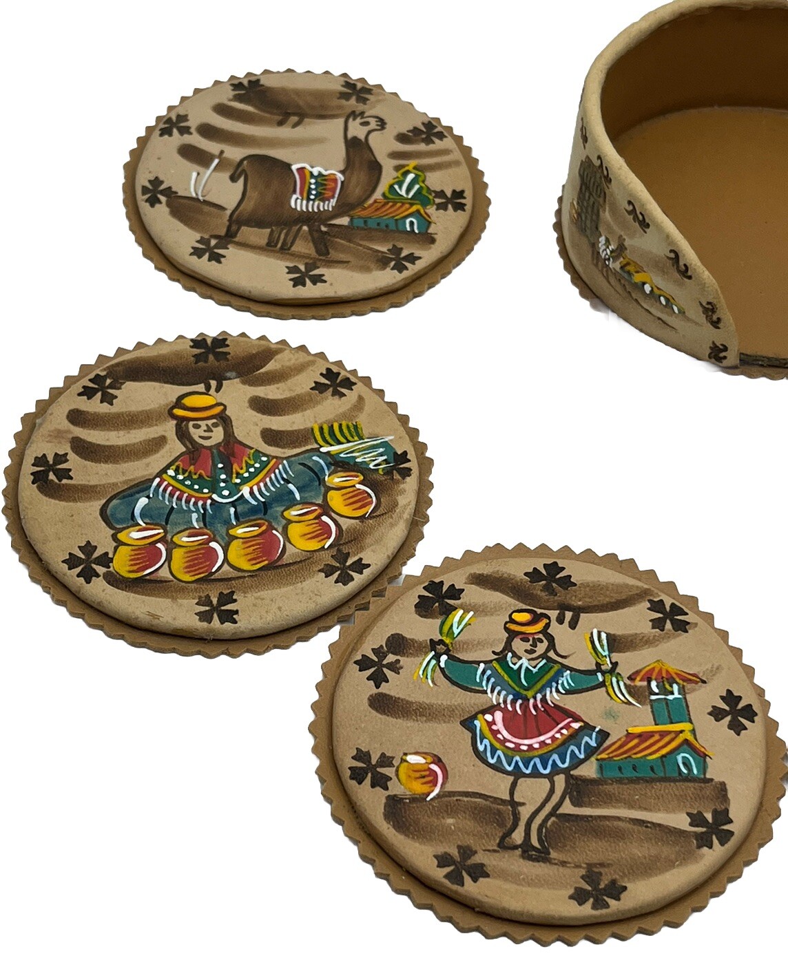 • Soft Suede Leather Hand Painted Peruvian Coasters Set of 6 With Holder
