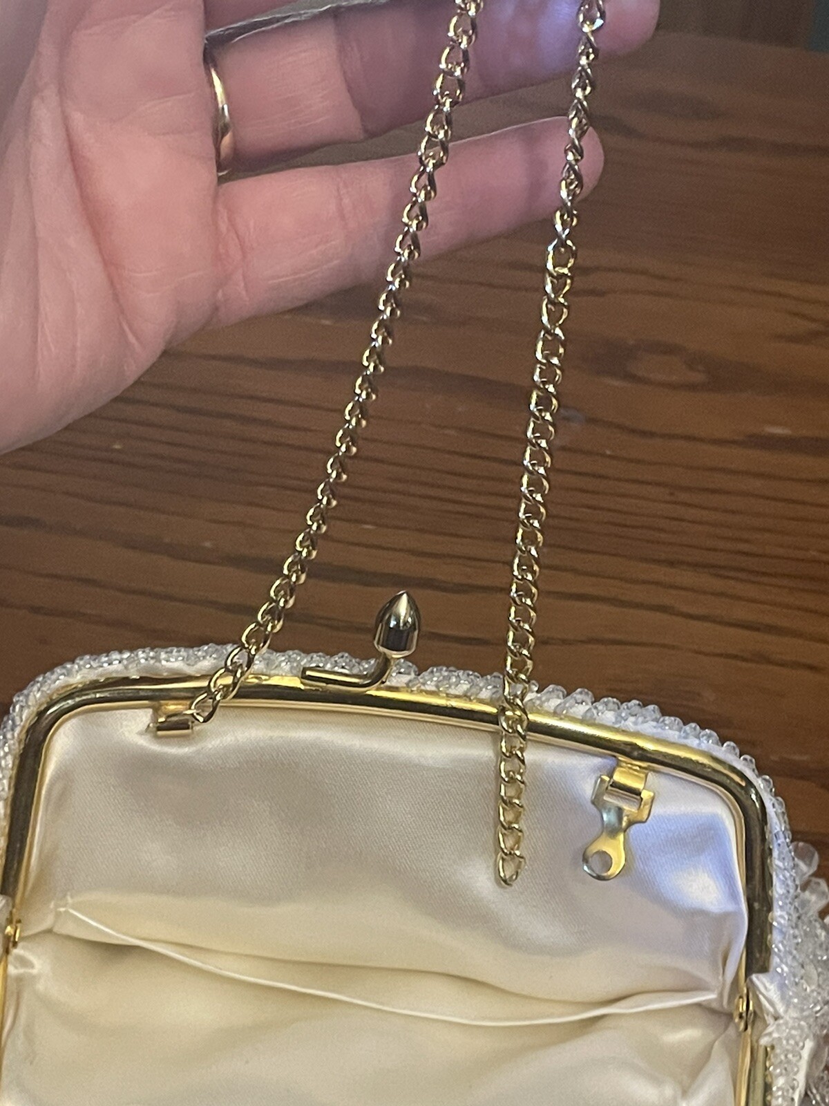 как выглядит womens ELEGANT Beaded Evening Bag white w/clear faceted dangle beads gold tone фото