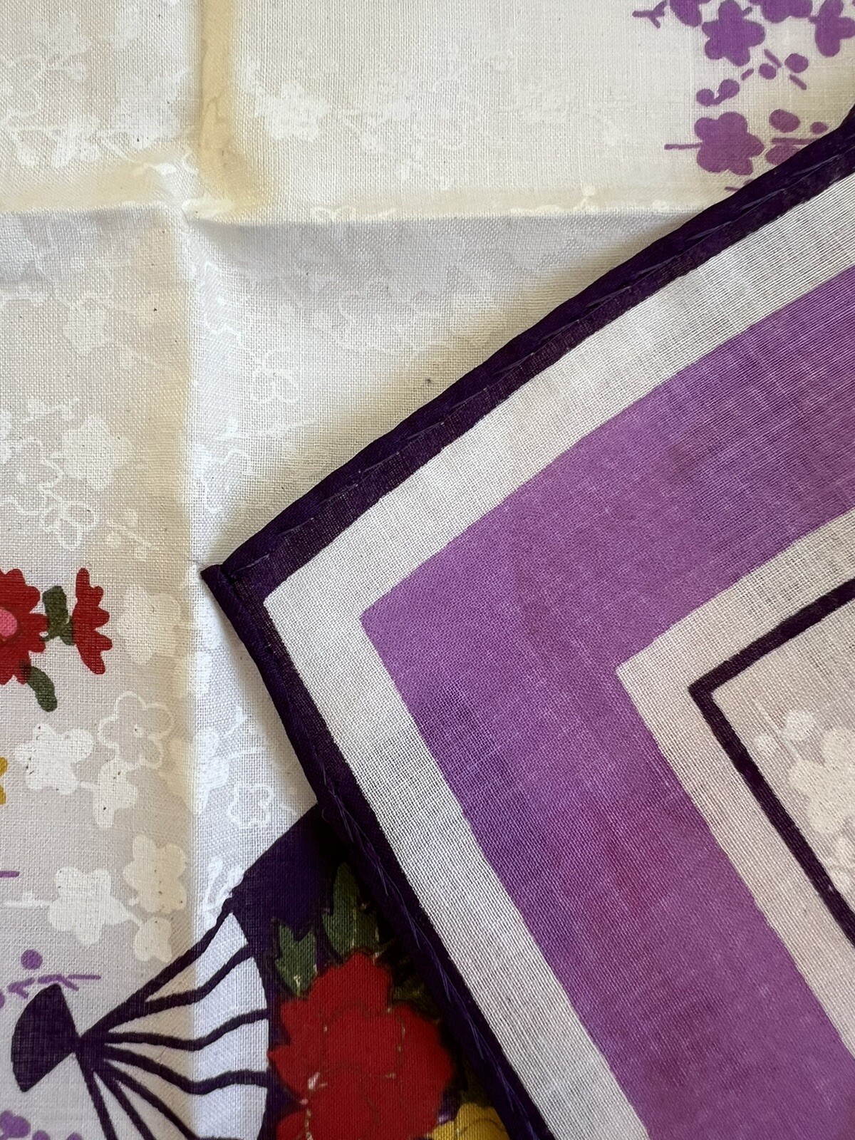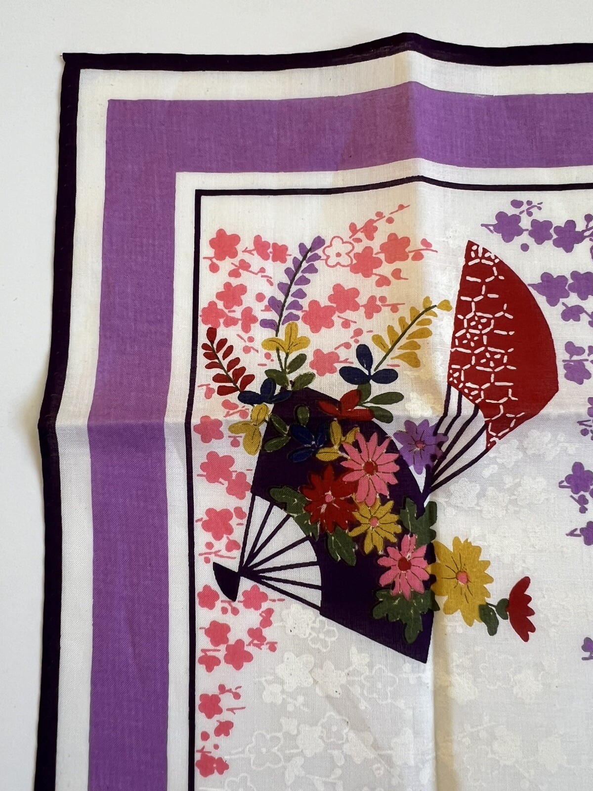 Vintage Handkerchief Floral Cotton Purple Flowers, Fans 18inch Square