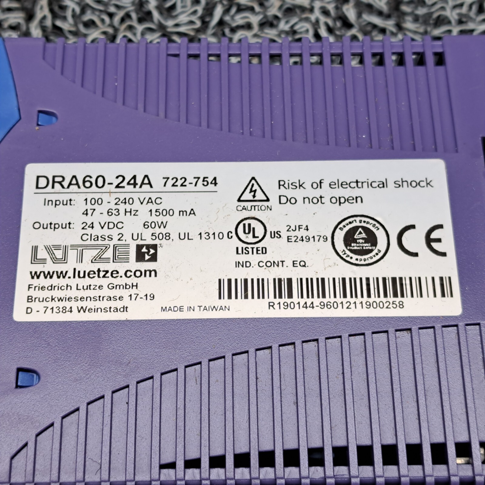 LUTZE DRA60-24A Power Supply 24 VDC 60 W DRA6024A. 100-240vac input