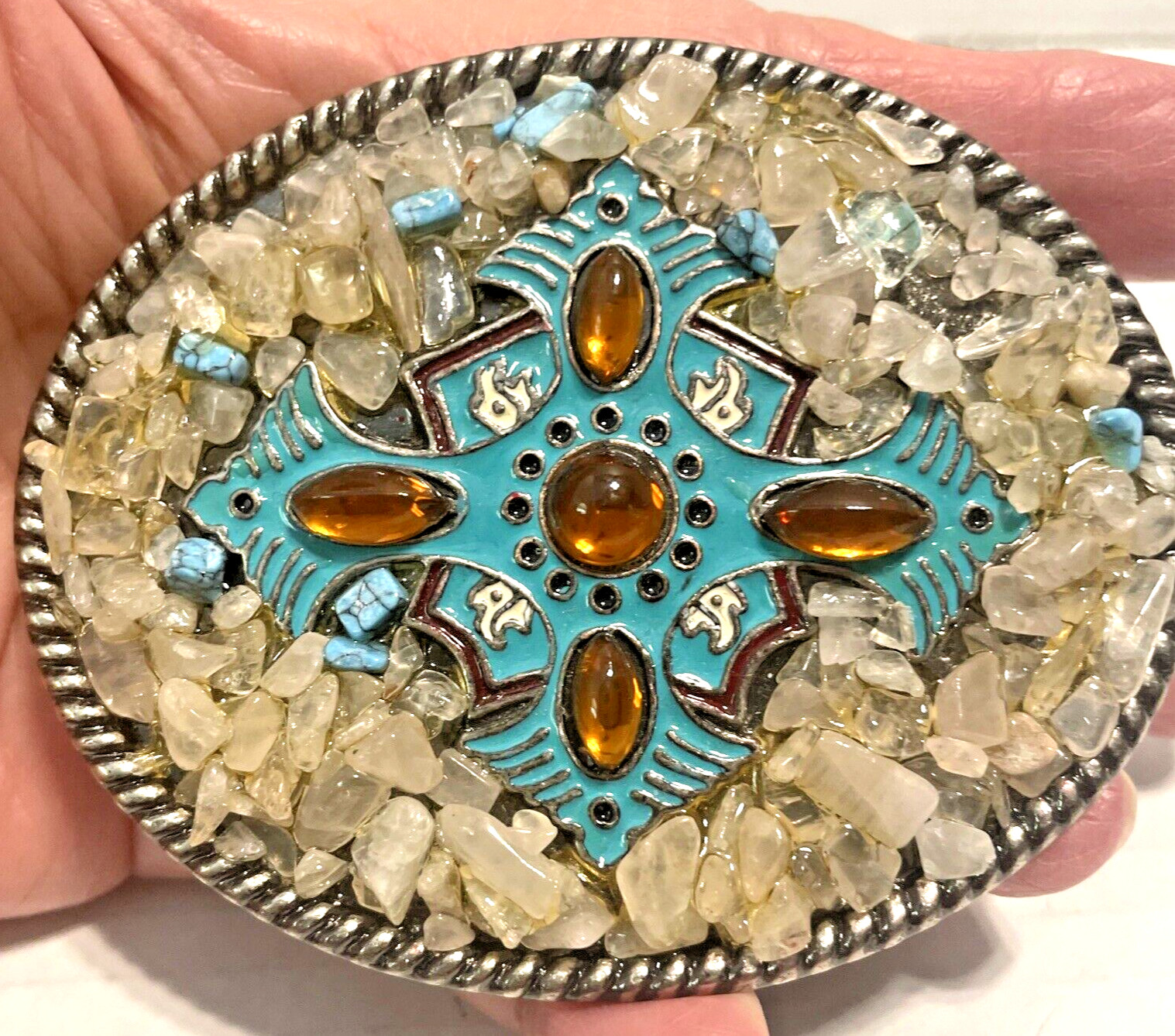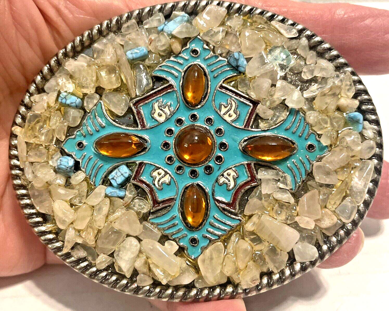 Western Stone Decorated Oval Silvertone Belt Buckle Made in the USA