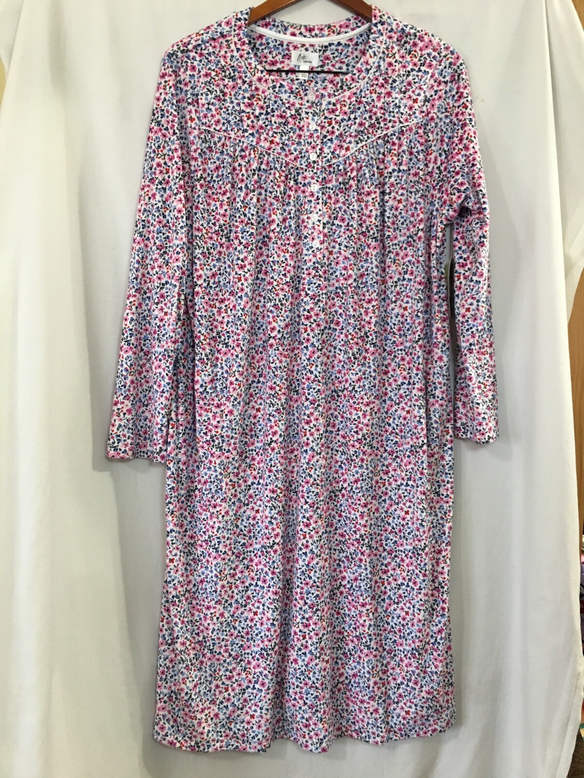 Aria Collection Nightgown Long Sleeve Velour Many Sizes White Floral Pockets New