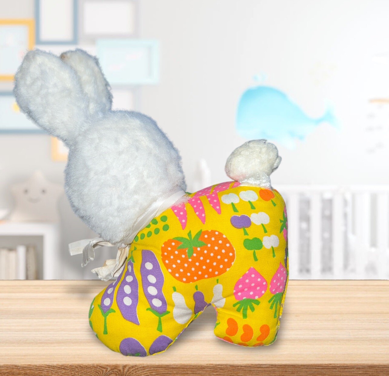 как выглядит Very Rare Vtg Eden Bunny Rattle Plush Yellow Multicolored Fruit Print Body фото