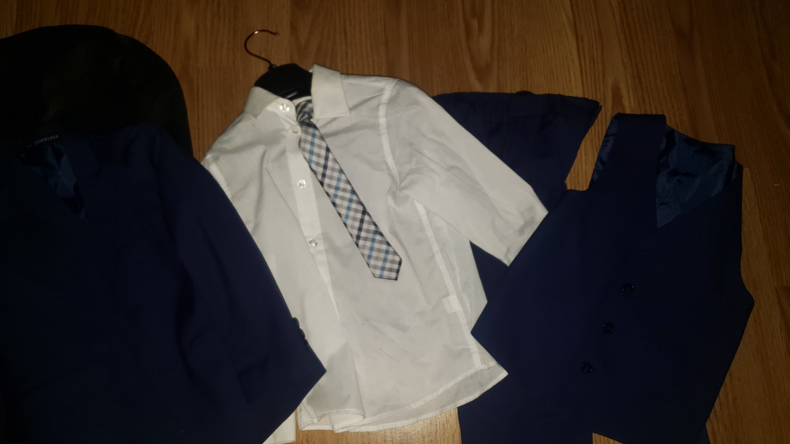 Set Includes: Jacket, Top, Vest, clip on tie, Pants