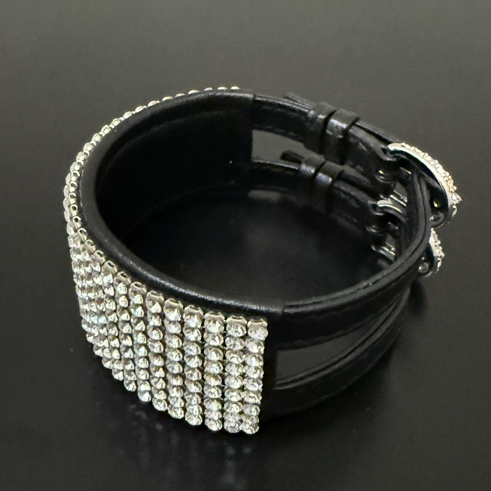 SWAROVSKI Swan Signed Crystal Rhinestones Leather Buckle Wide Cuff Bracelet 24g.