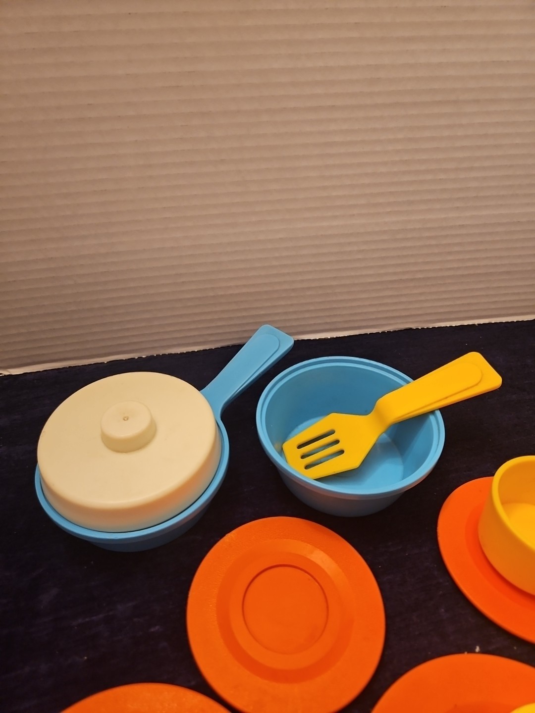 Vintage Fisher Price Fun with Food dishes playset 11 pieces plates pan cups fork