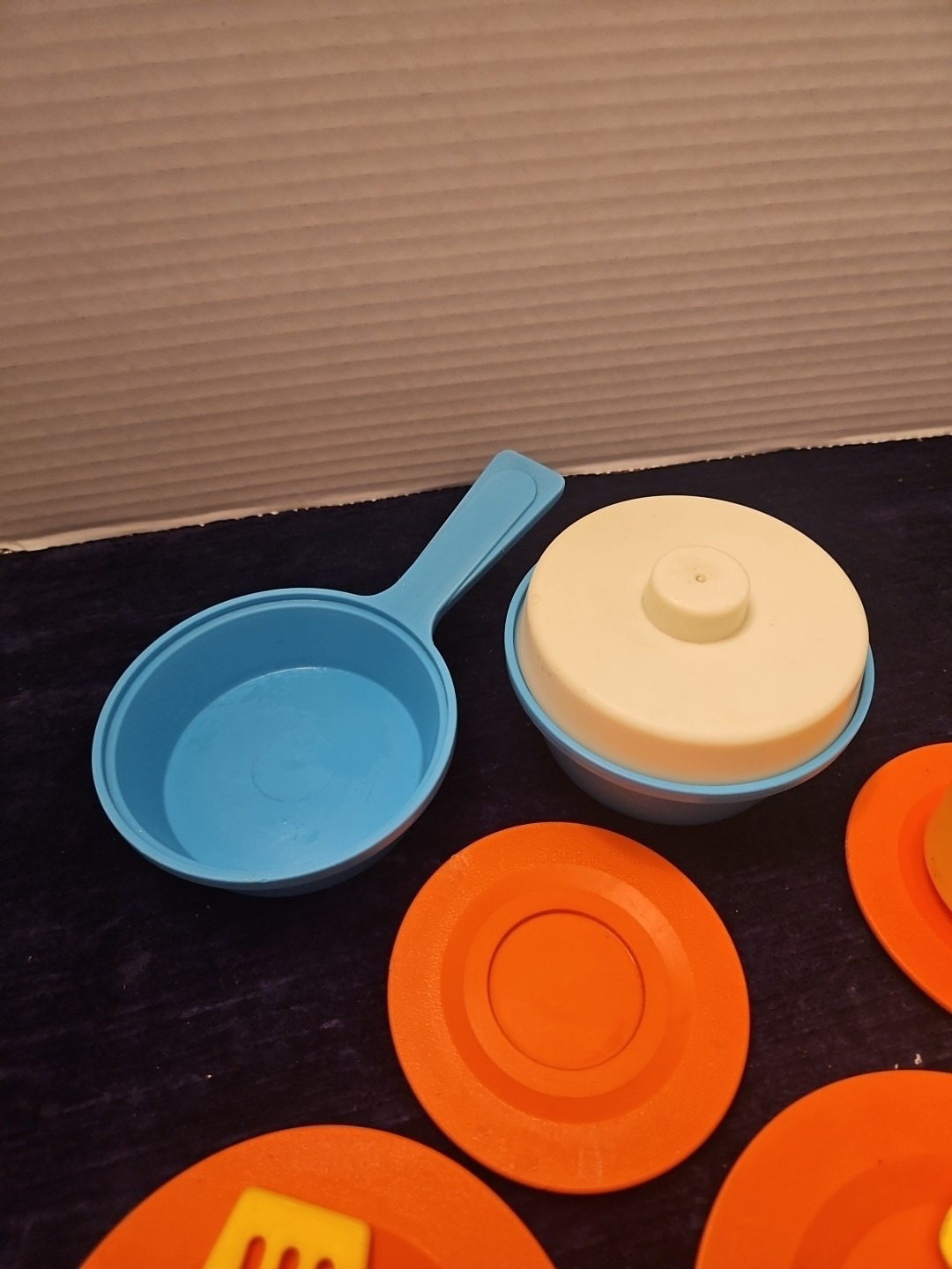 как выглядит Vintage Fisher Price Fun with Food dishes playset 11 pieces plates pan cups fork фото