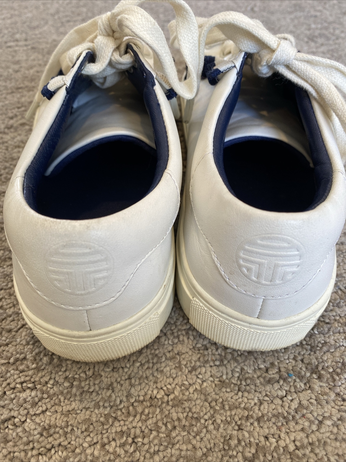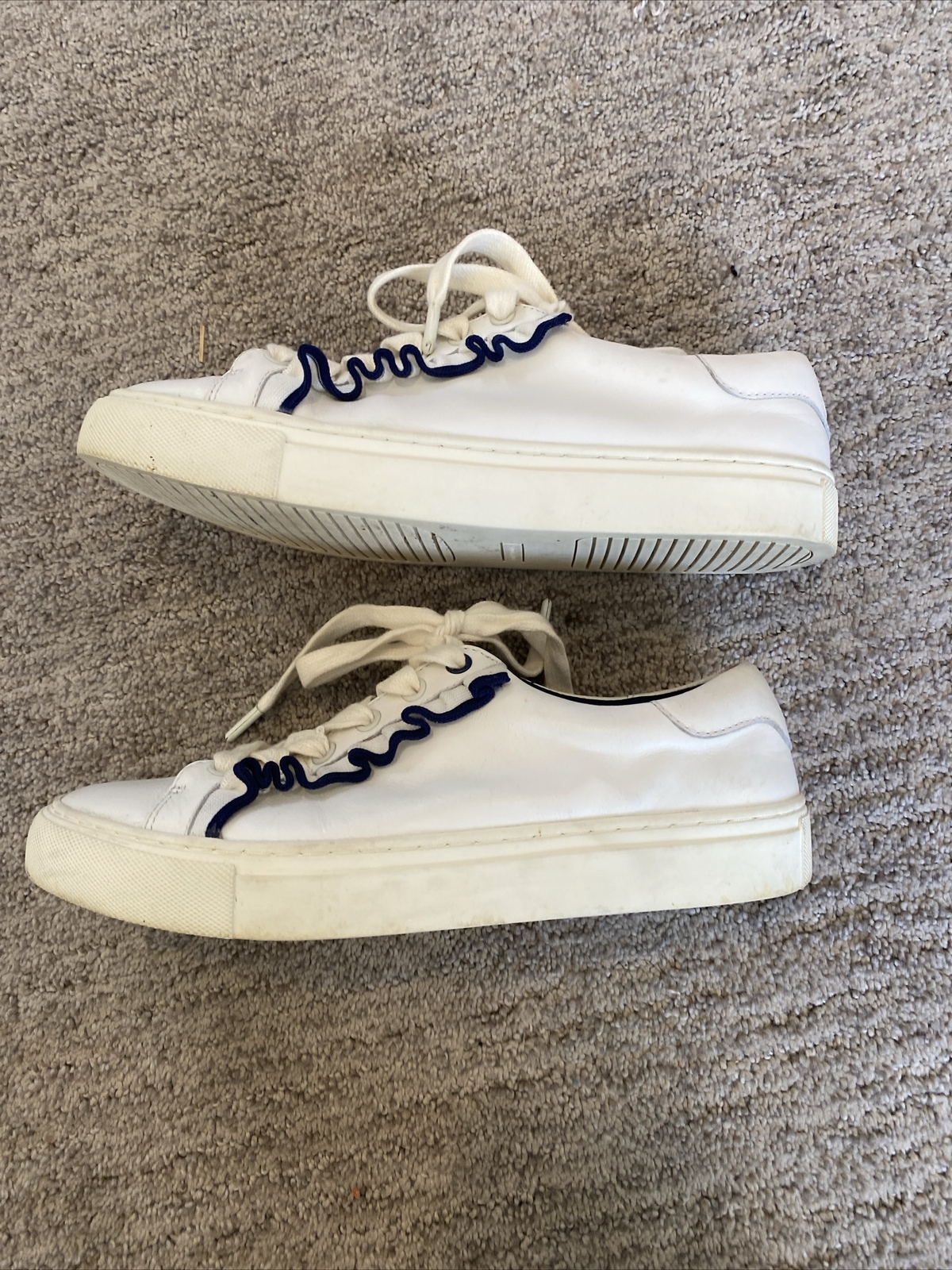 как выглядит TORY BURCH Sport Snow White/Navy Blue ruffle leather tie sneakers-Size 6 фото