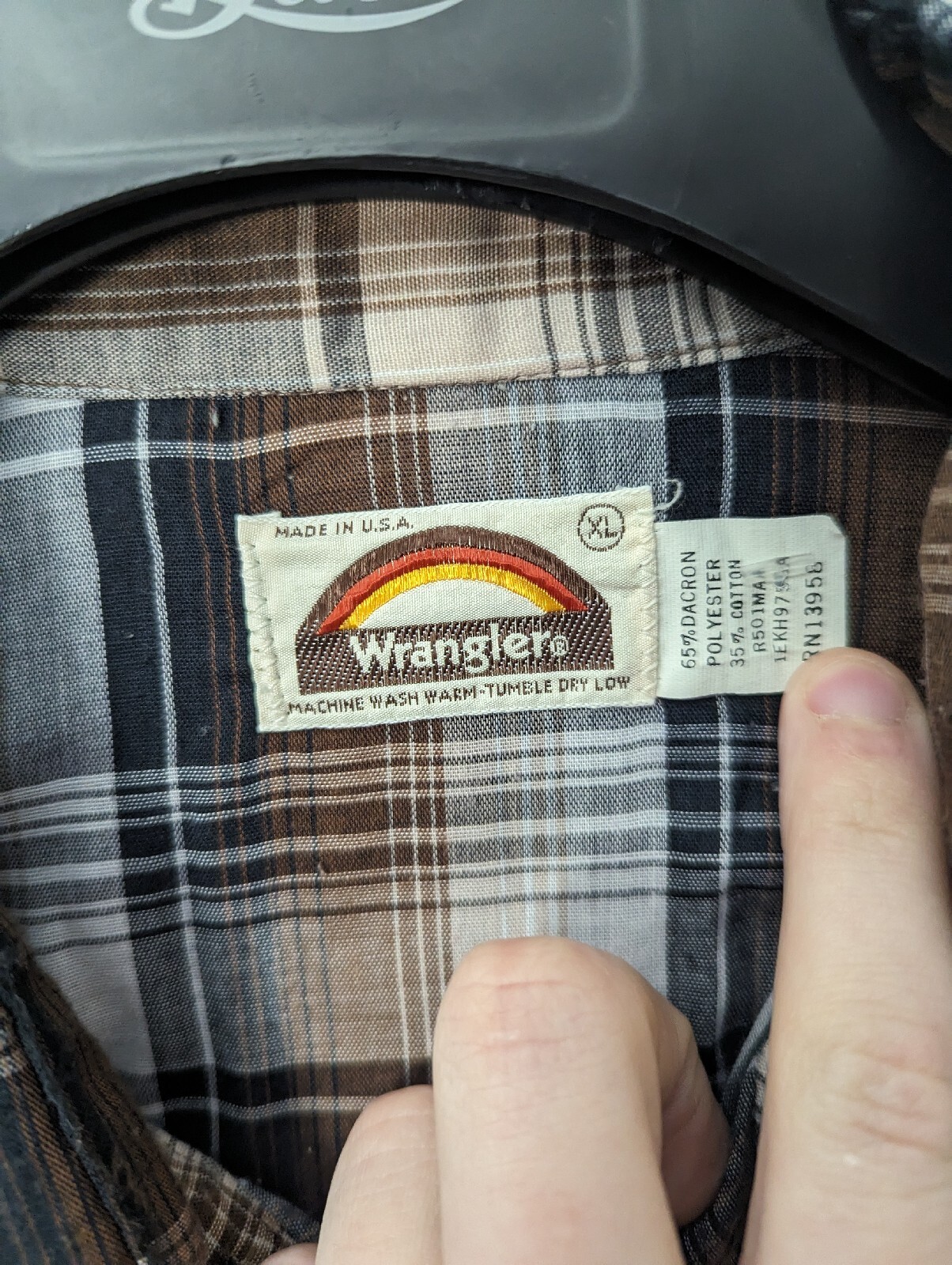 Vintage 70s USA Wrangler Pearl Snap Western Shirt XL Brown Plaid Rainbow Tag