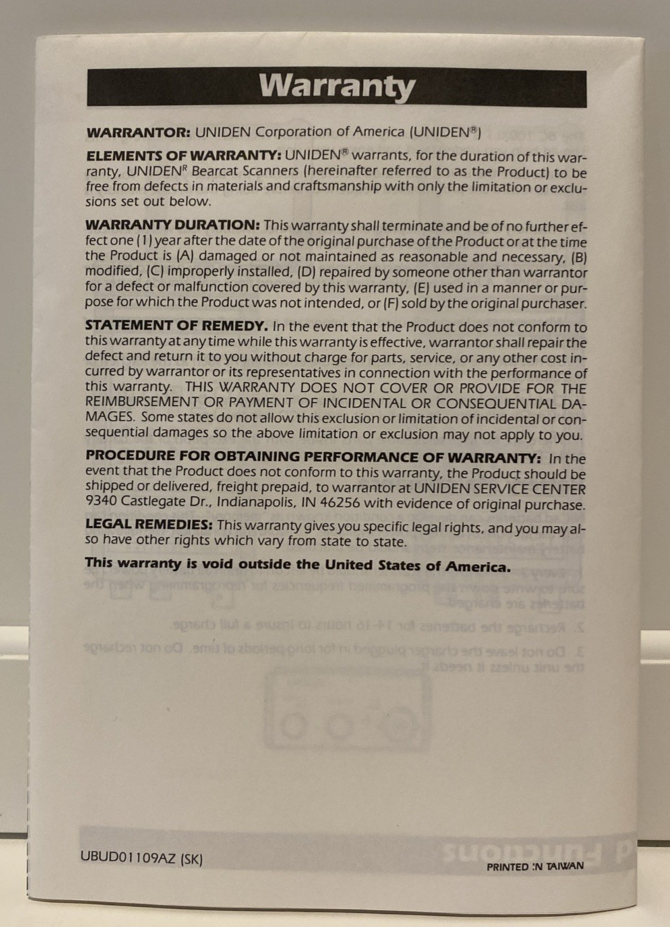 Vtg Orig 1987 Uniden Bearcat BC 100XLT Operating Guide Instructions Form