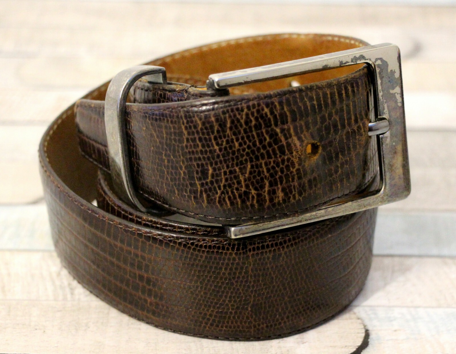 как выглядит AnnaBella BROWN GENUINE LEATHER LIZARD EMBOSSED CASUAL WOMENS BELT Sz M 23D фото