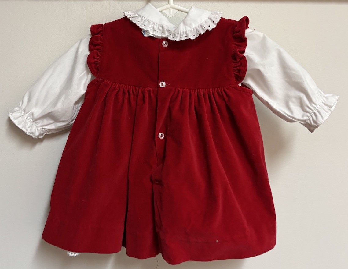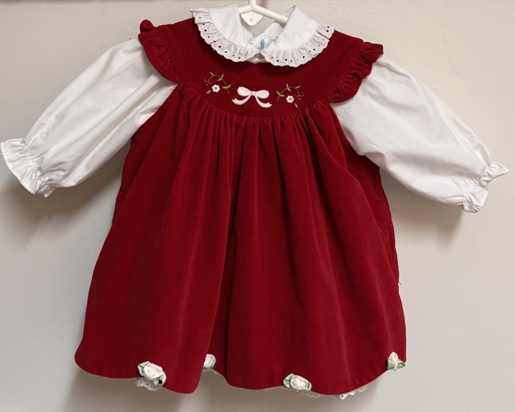 Vintage Baby Girl Red Velvet Dress Embroidered Jumper w/ White Eyelet Dress 6-9M
