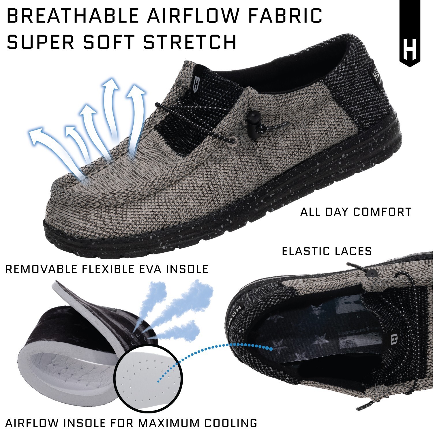 Особенности: BREATHABLE, EASY ON AND OFF, LIGHT WEIGHT, REMOVABLE “WE THE PEOPLE” EVA INSOLE, UNISEX SIZING