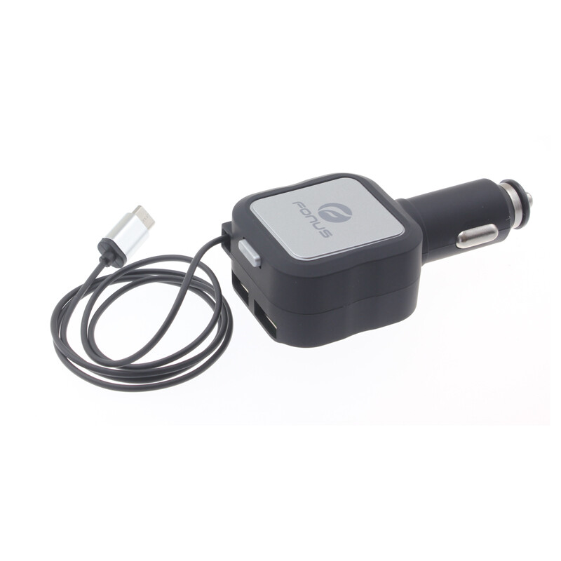 Car Charger Retractable 4.8Amp Type-C 2-Port USB Fast Charge DC for Cell Phones