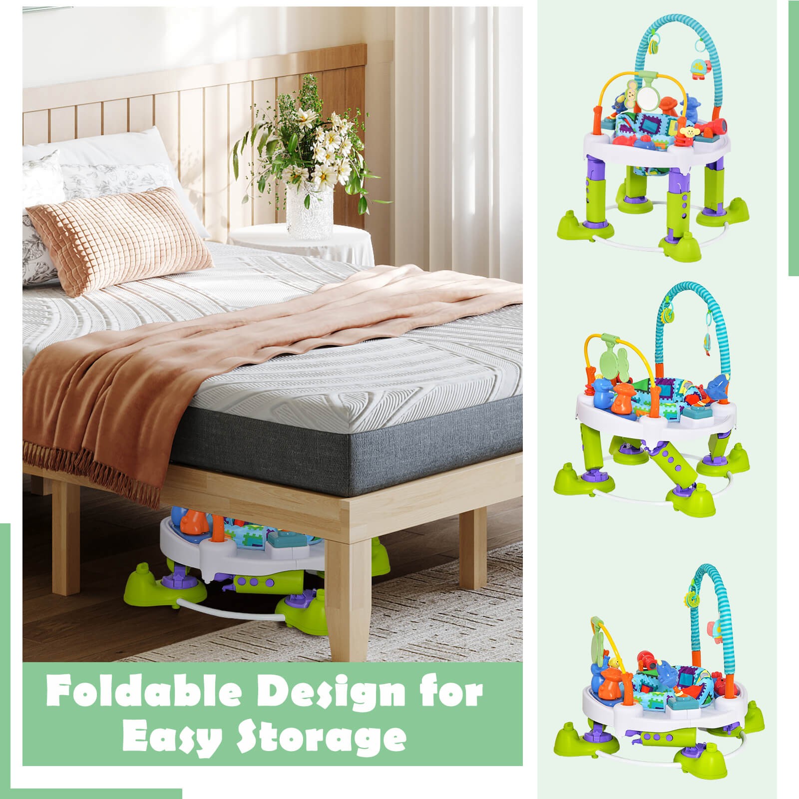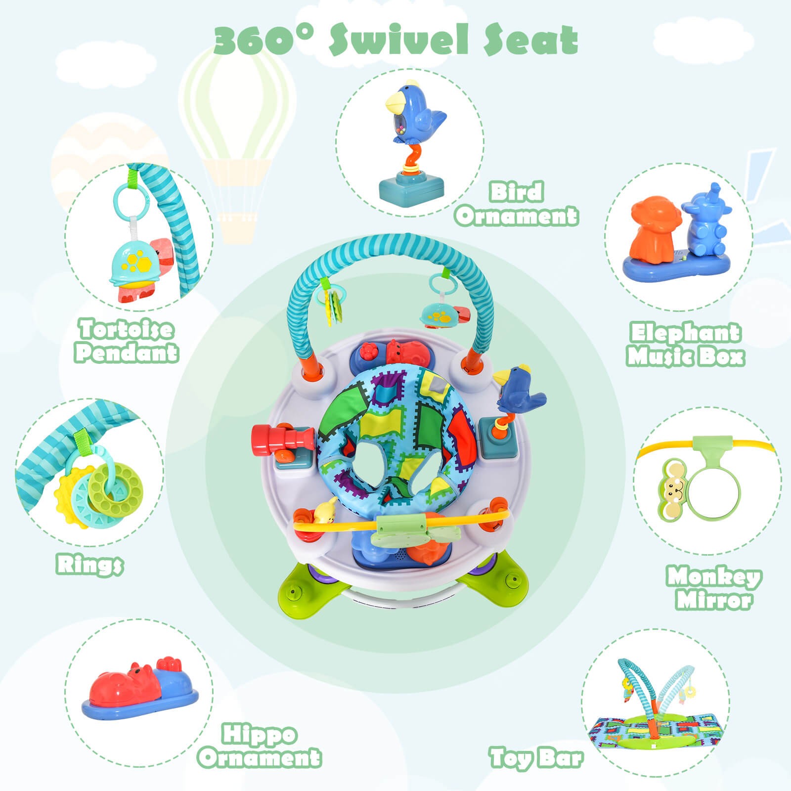 Set Includes: 1 x Bouncing Activity Saucer, 1 x Play Mat, 1 x Instruction